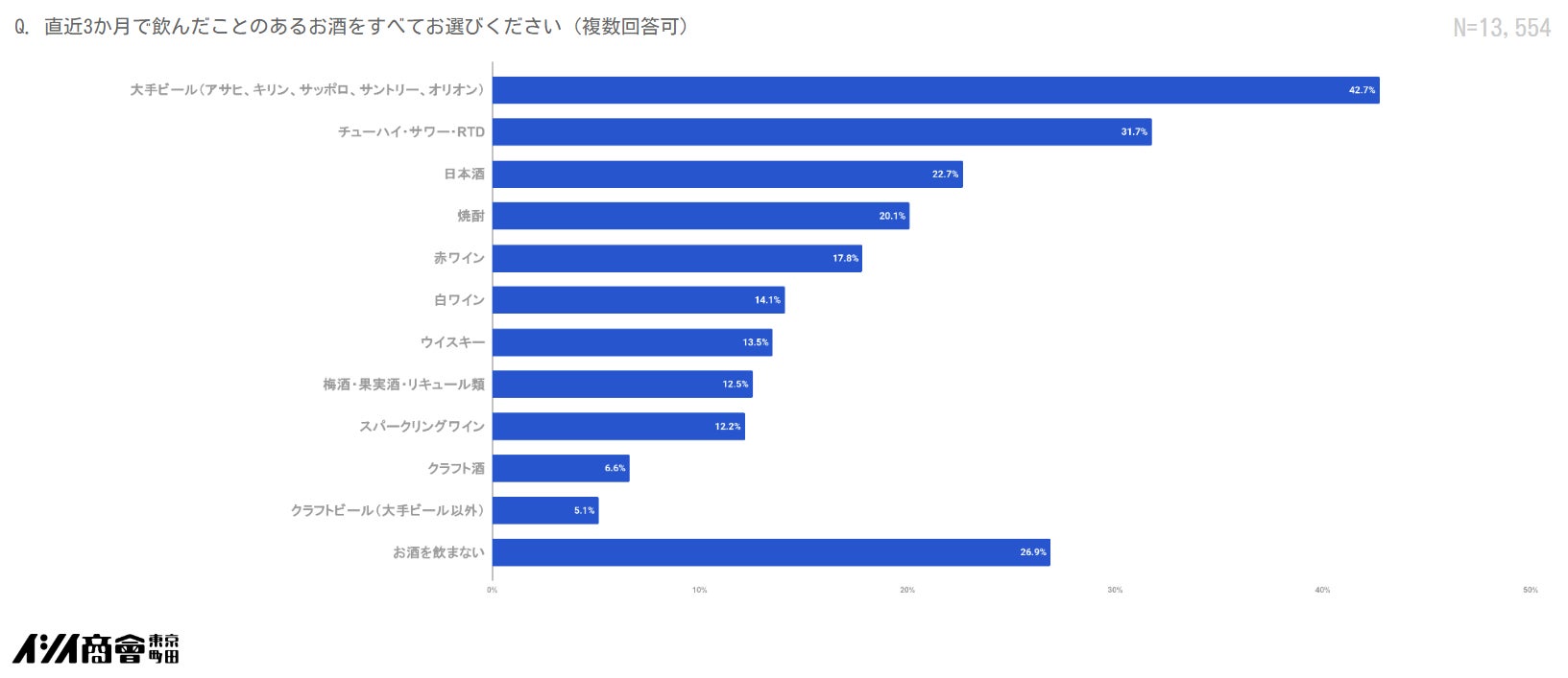 事前の調査にて、20代から60代の男女13,554人に3か月以内での飲酒状況を尋ねたところ、クラフトビール(大手ビール以外)を飲んだと答えた人は5.1%で、今回聴取した酒類カテゴリの中でも低い水準となりました。