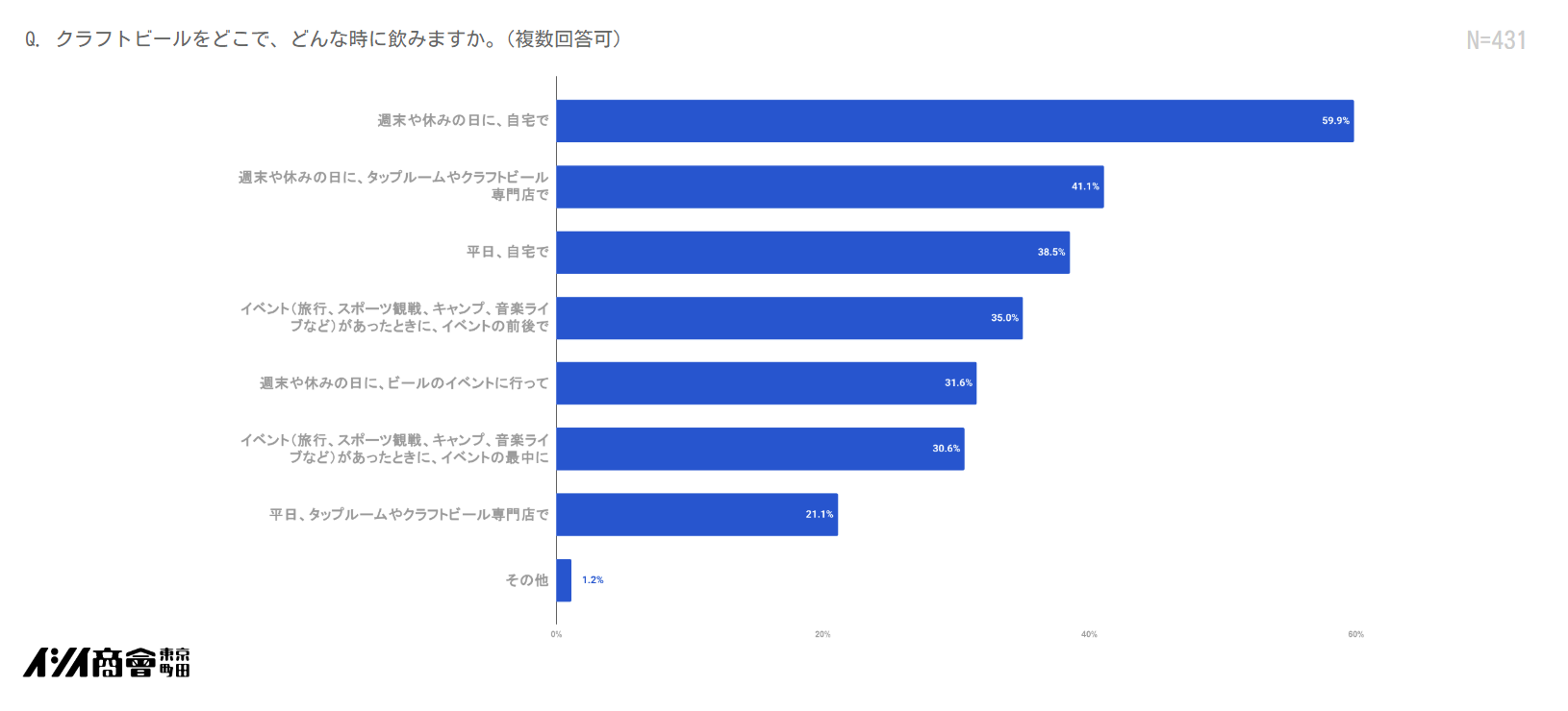 クラフトビールを飲むシーンは、「週末や休日に自宅で」が59.9% と最も多く、次いで「週末や休日にタップルームやクラフトビール専門店で」41.1%、「平日に自宅で」38.5%、「イベントの前後で」35.0% となりました。