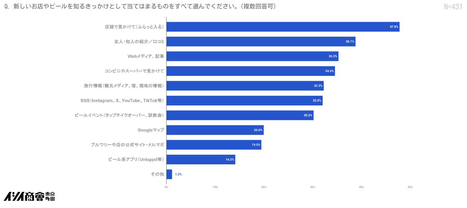 新しいお店やビールを知るきっかけは、「店頭で見かけて(47.8%)」が最多で、次いで「友人・知人の紹介/口コミ(38.7%)」「Webメディア・記事(35.3%)」「コンビニやスーパーで見かけて(34.6%)」となりました。