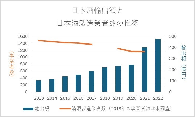 一方、日本のお酒は、日本酒、焼酎、梅酒の3種が代表的であり、その中でも日本酒は、”sake”、または、“rice wine”とも称され、海外でも人気となっています。日本酒の輸出金額は、2022年まで13年連続で過去最高額を更新し続けて約475億円にまでなっているように、世界的に需要が高まっています。