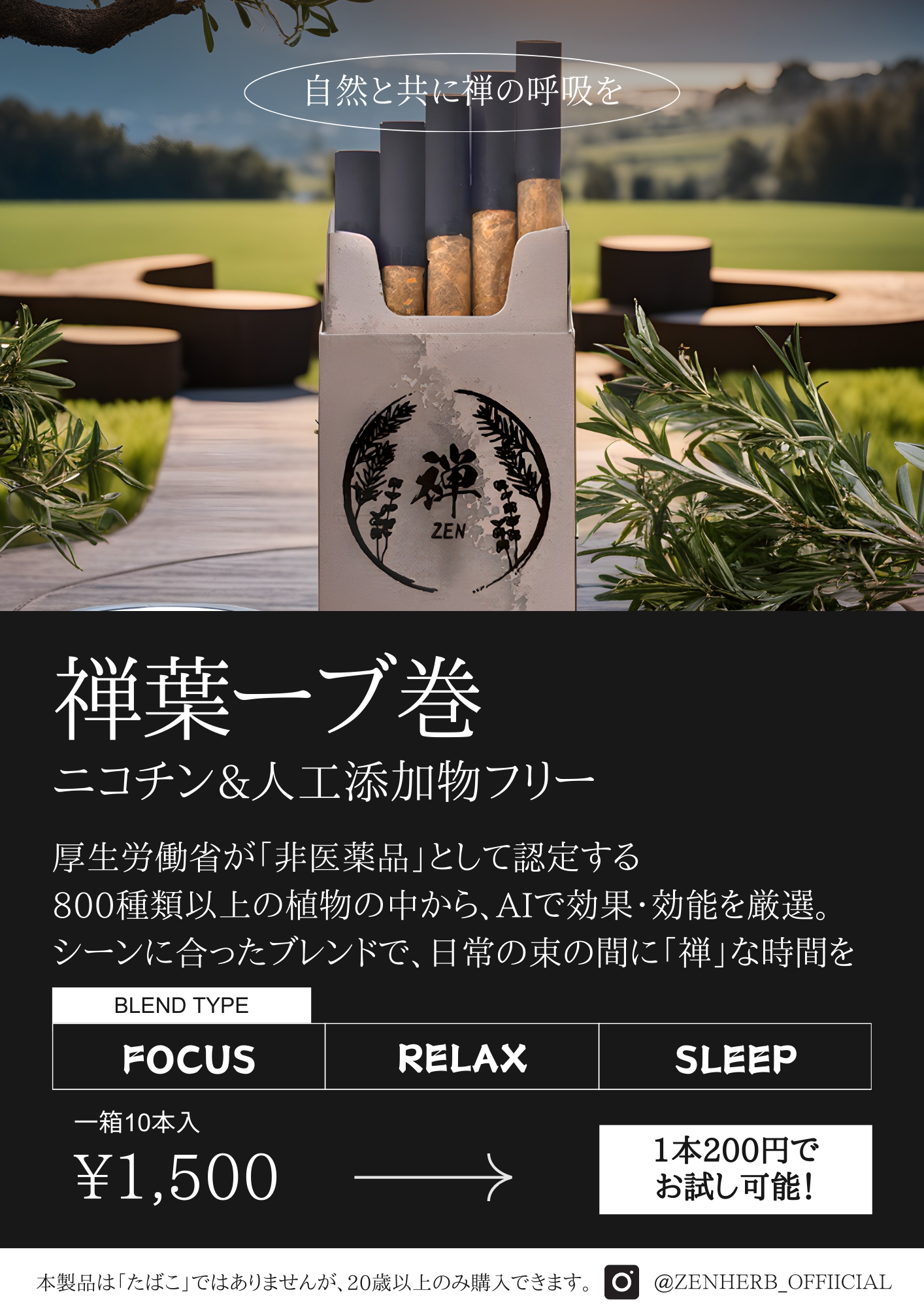 現在禅ハーブでは「Focus : 目覚めの一服」、「Relax : 疲れた時の一服」、「Sleep : 寝る前の一服」のシーンに合った独自ブレンド3種類を販売しており、ストレスフルな日常の束の間に「禅」の時間を提供しています。