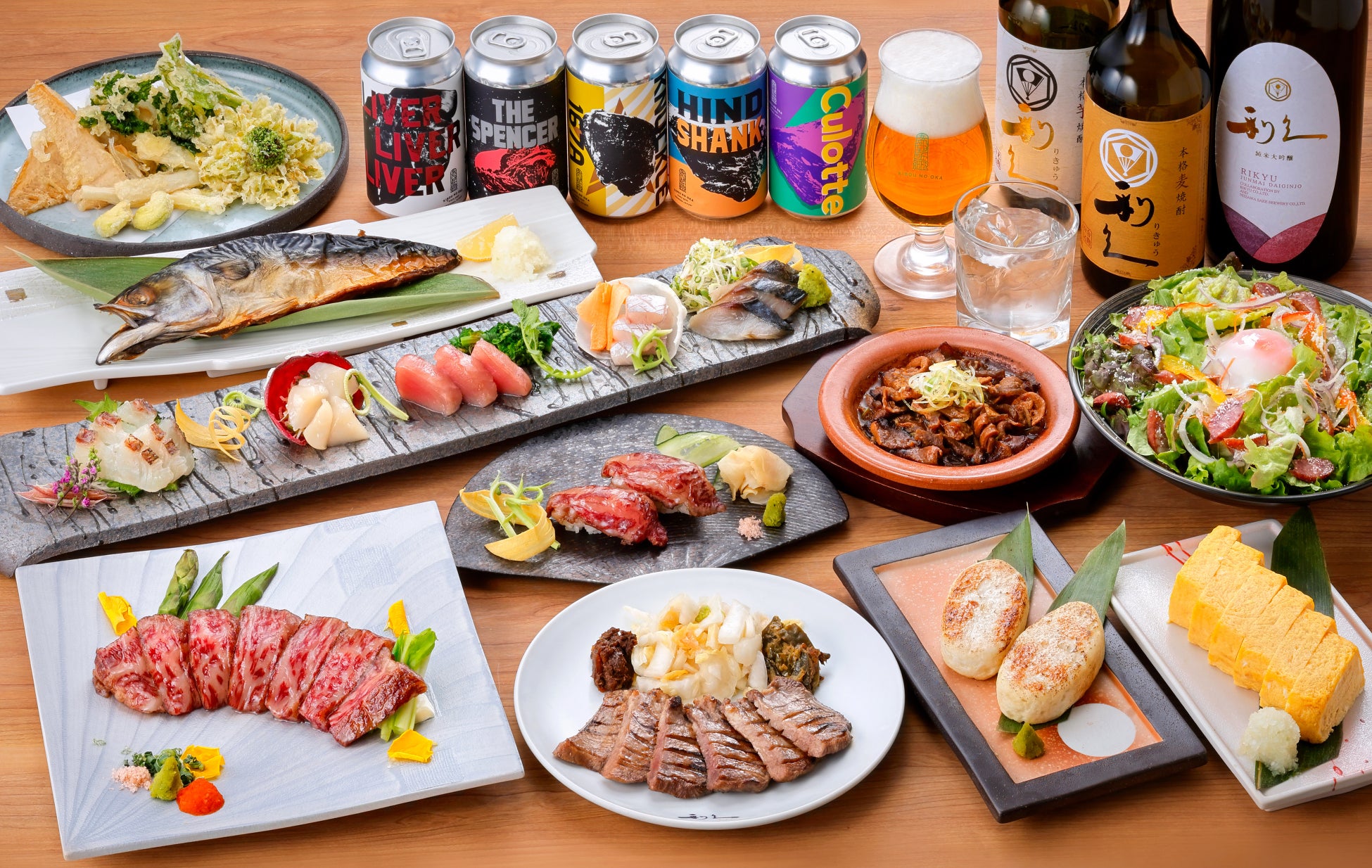 定規山の三角揚げや、利久特製の笹かまぼこ、炭火焼き料理など、地場食材を活かしたメニューで、宮城県の豊かな食文化をご堪能いただけます。また、週替わりで提供される樽生のクラフトビールや、IFFA(食肉加工の国際見本市)金賞受賞のソーセージもお楽しみいただけます。