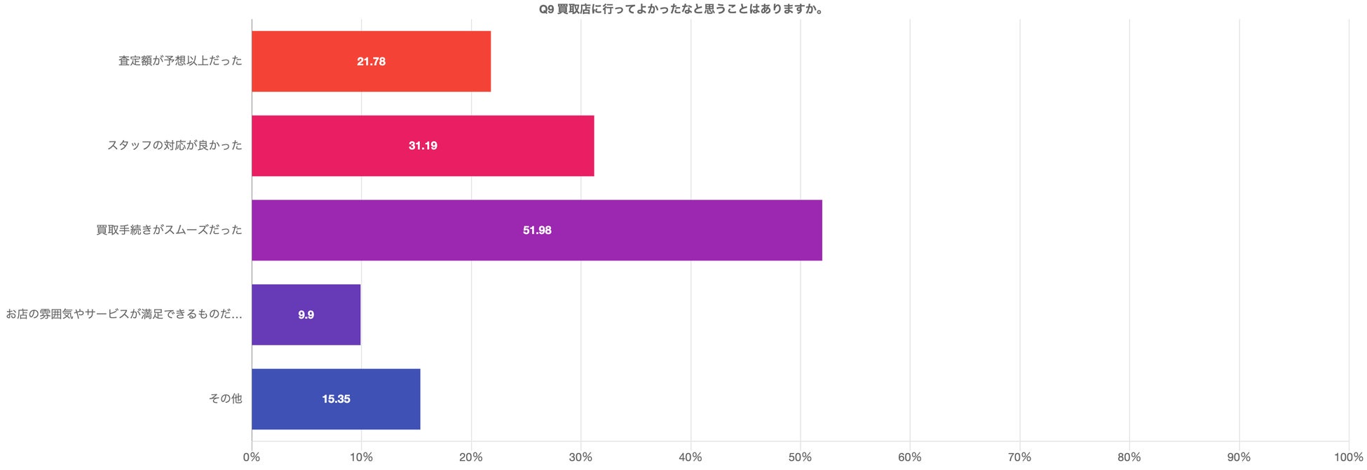 査定額が予想以上だった21.78%、スタッフの対応が良かった31.19%、買取手続きがスムーズだった51.98%、お店の雰囲気やサービスが満足できるものだった9.9%、その他15.35%とサービス内容や査定額(サービス群)より対応、手続きのスムーズさの回答が高く、