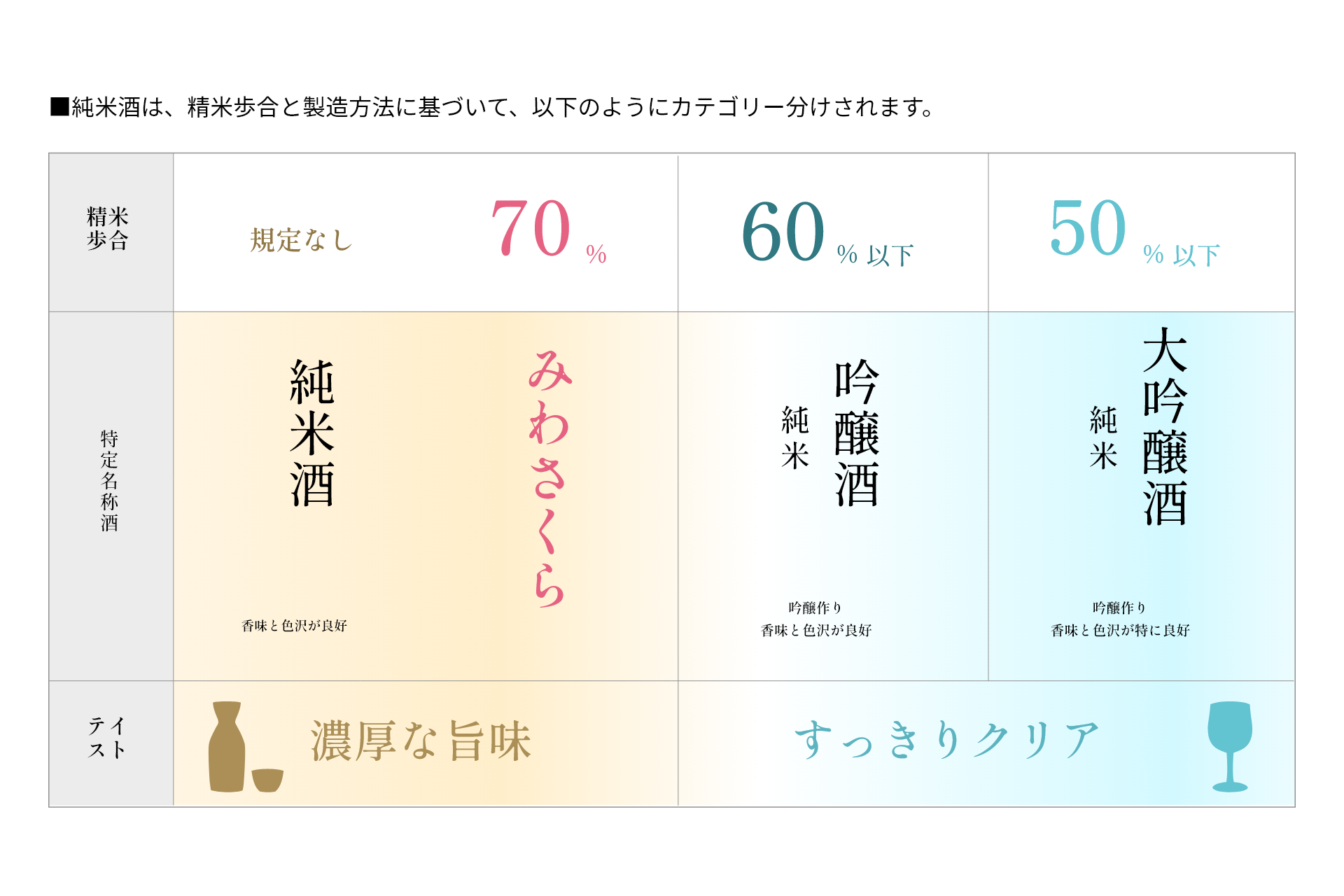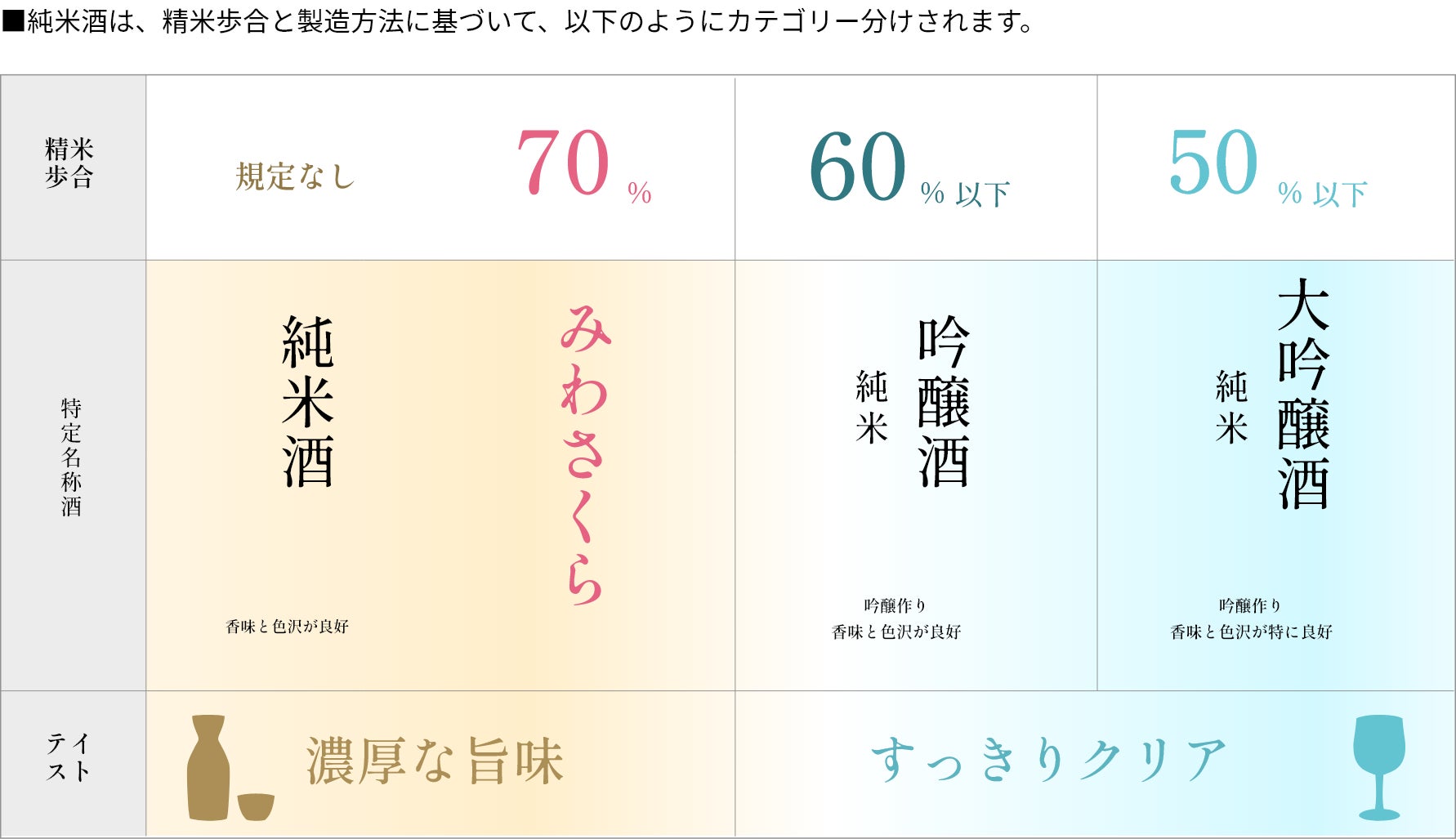 日本酒の旨味成分であるアミノ酸は、麹のもつ酵素がタンパク質を分解する過程で生成されます。タンパク質は米の表面に多く含まれるため、精米歩合70%の『みわさくら』は旨味が多い傾向にあります。