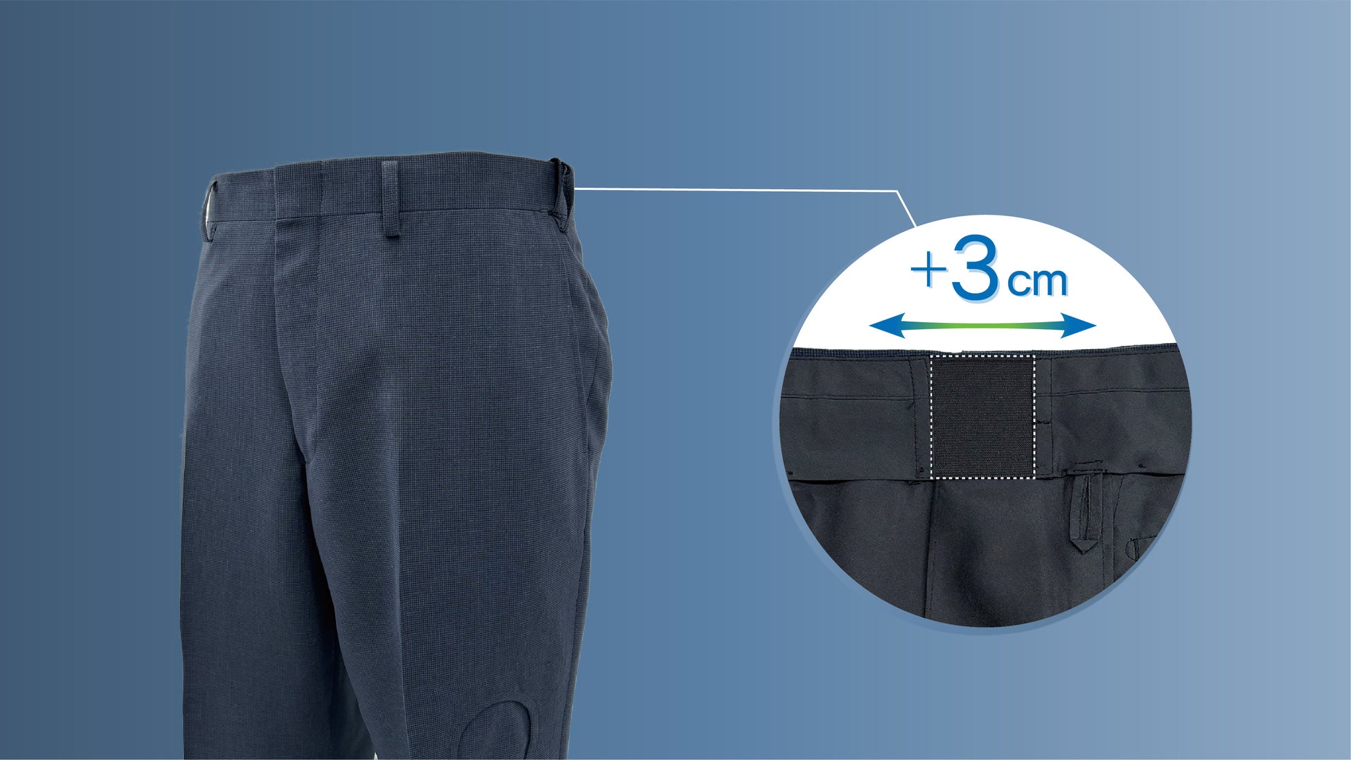 ウエスト周りは、見た目はただのスラックスなのに、ウエストが約3㎝伸びる特殊な仕様を搭載。