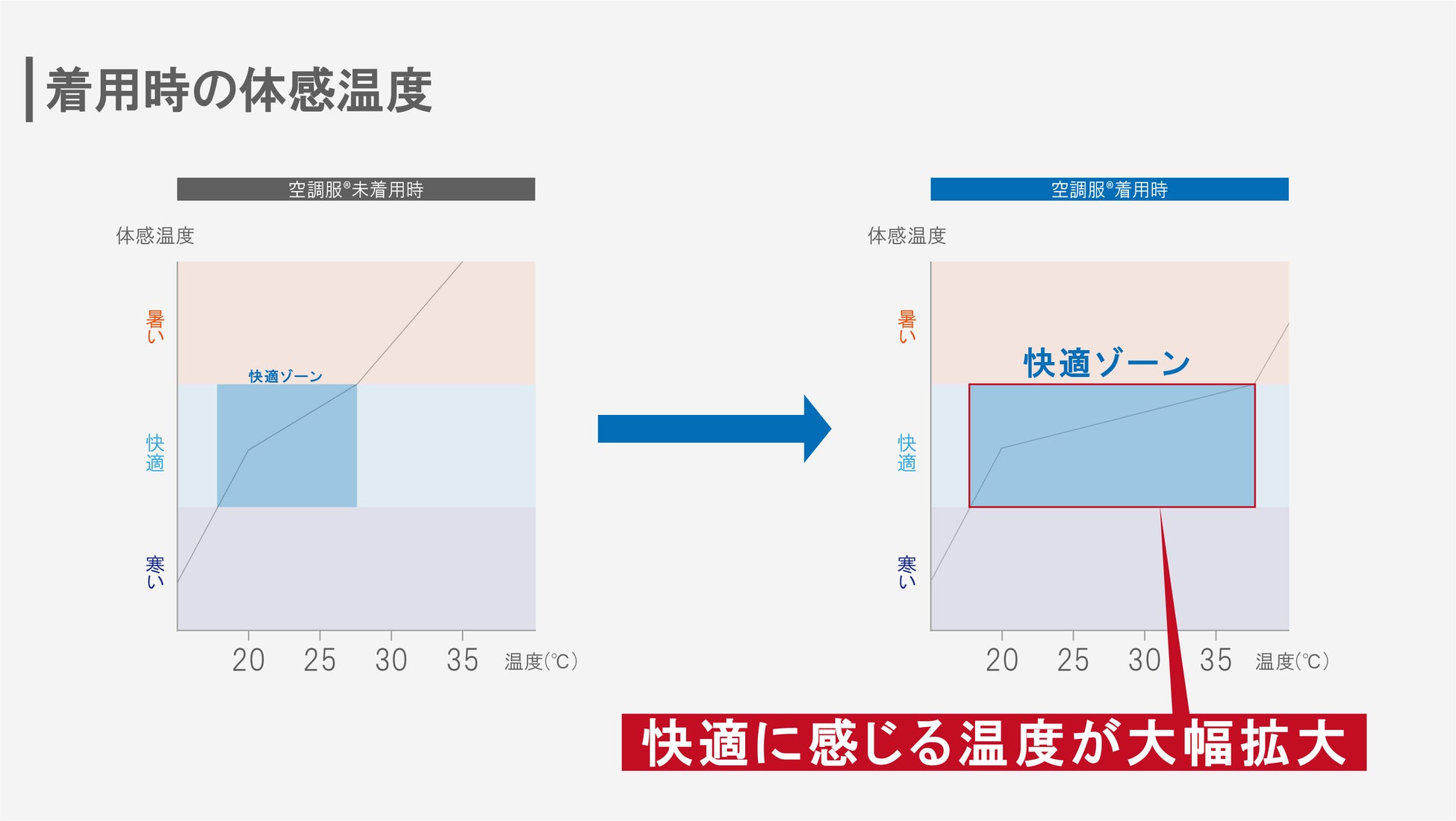 「空調服®スラックス」を着用することによって、身体の冷却に寄与しない無駄な汗が蒸発し、快適に感じる温度範囲を大幅に拡大することができます。