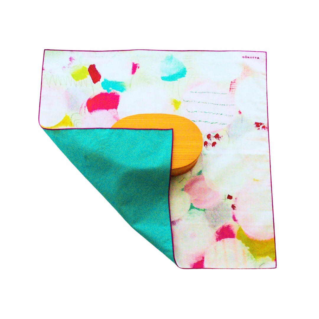 二枚の布、アート面と単色面にバイカラー縫い合わせたデザインが魅力の アートハンカチシリーズ。