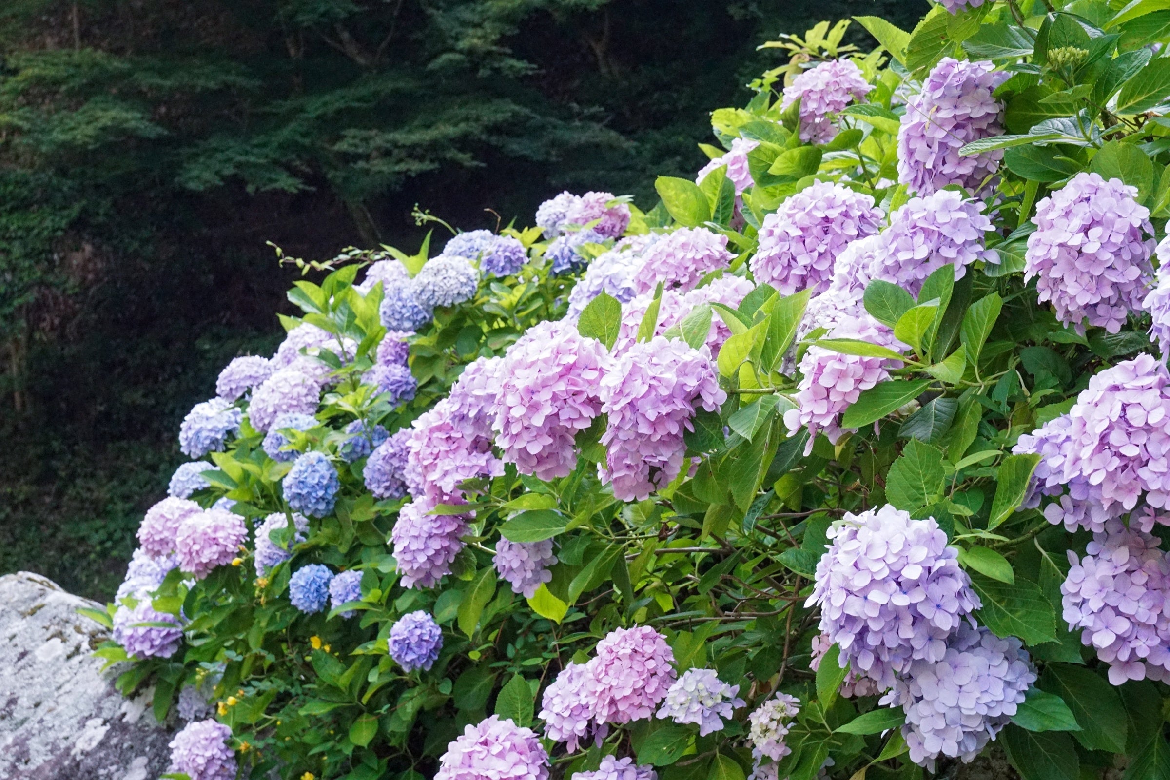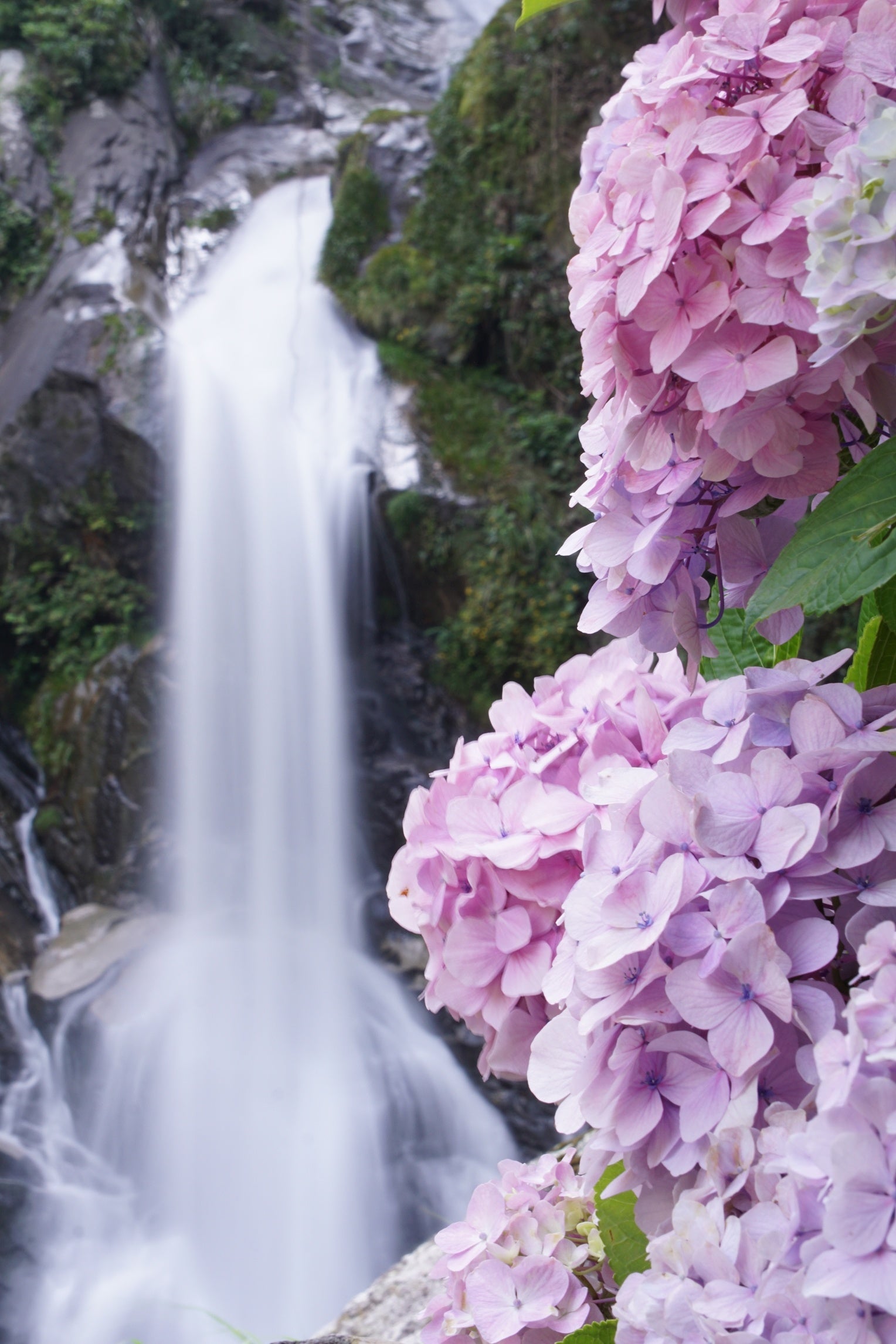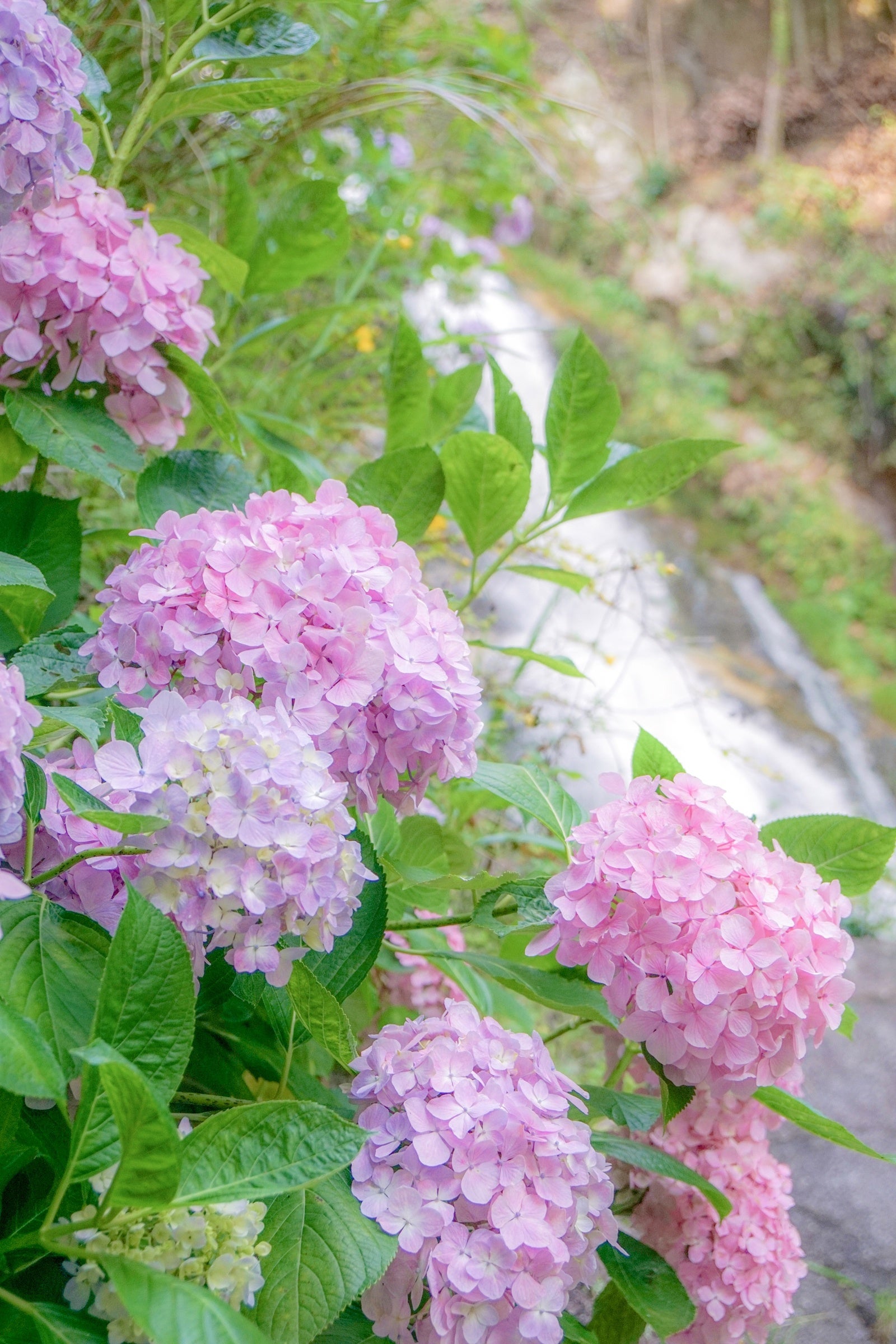 日本の滝百選に選定された九州最大級の落差を誇る名瀑「見帰りの滝」の滝周りと滝に至る道すがらに50種4万株のあじさいが咲き誇ります。