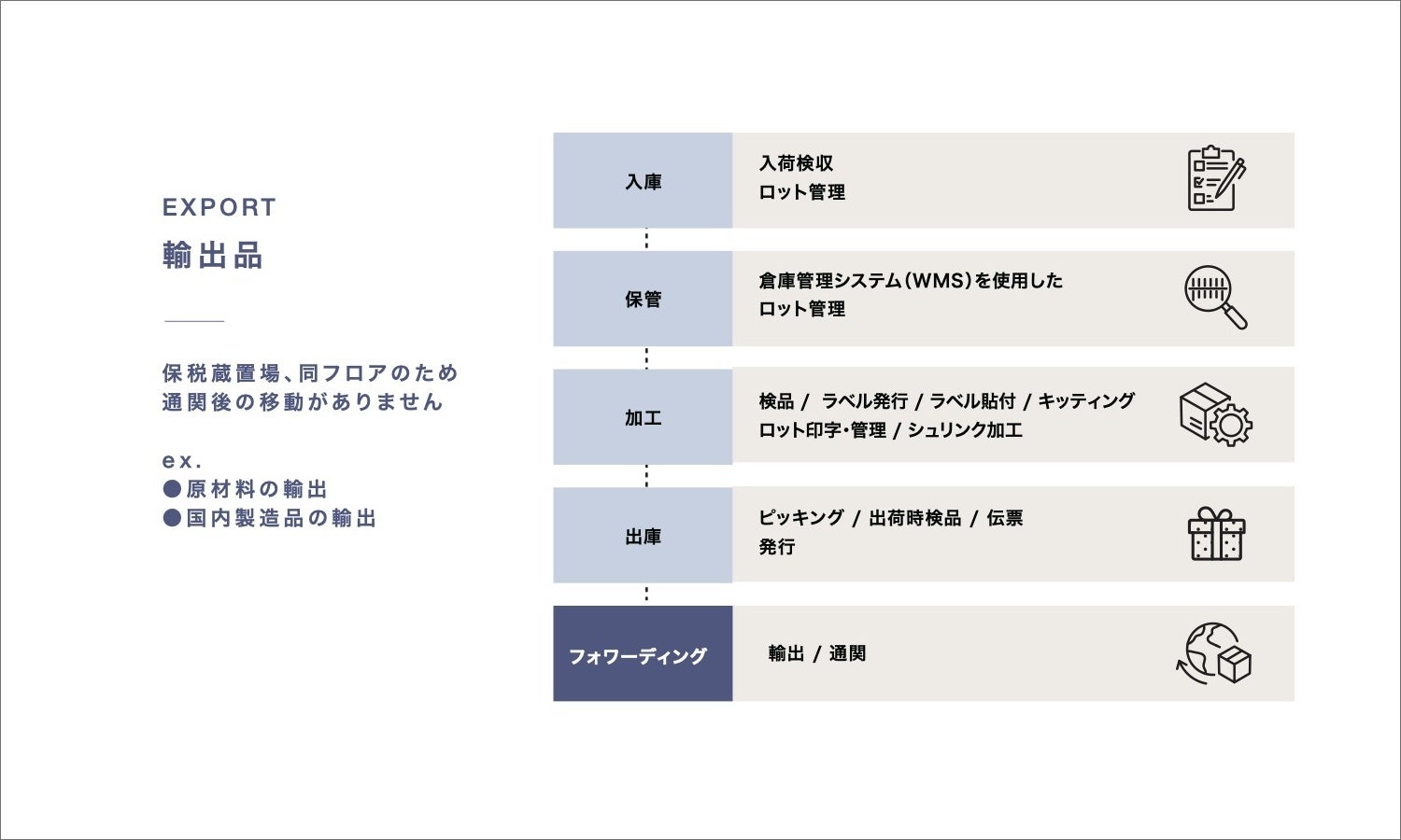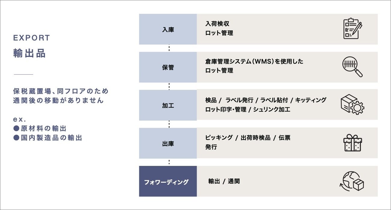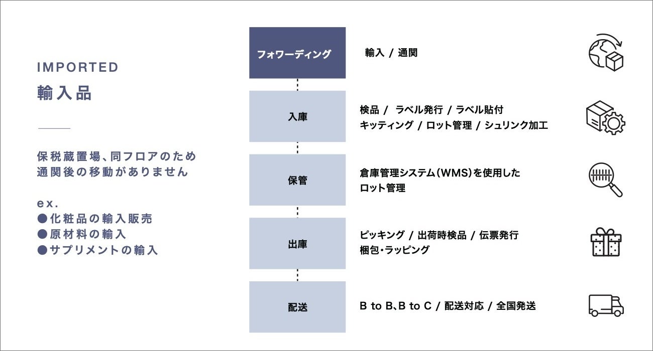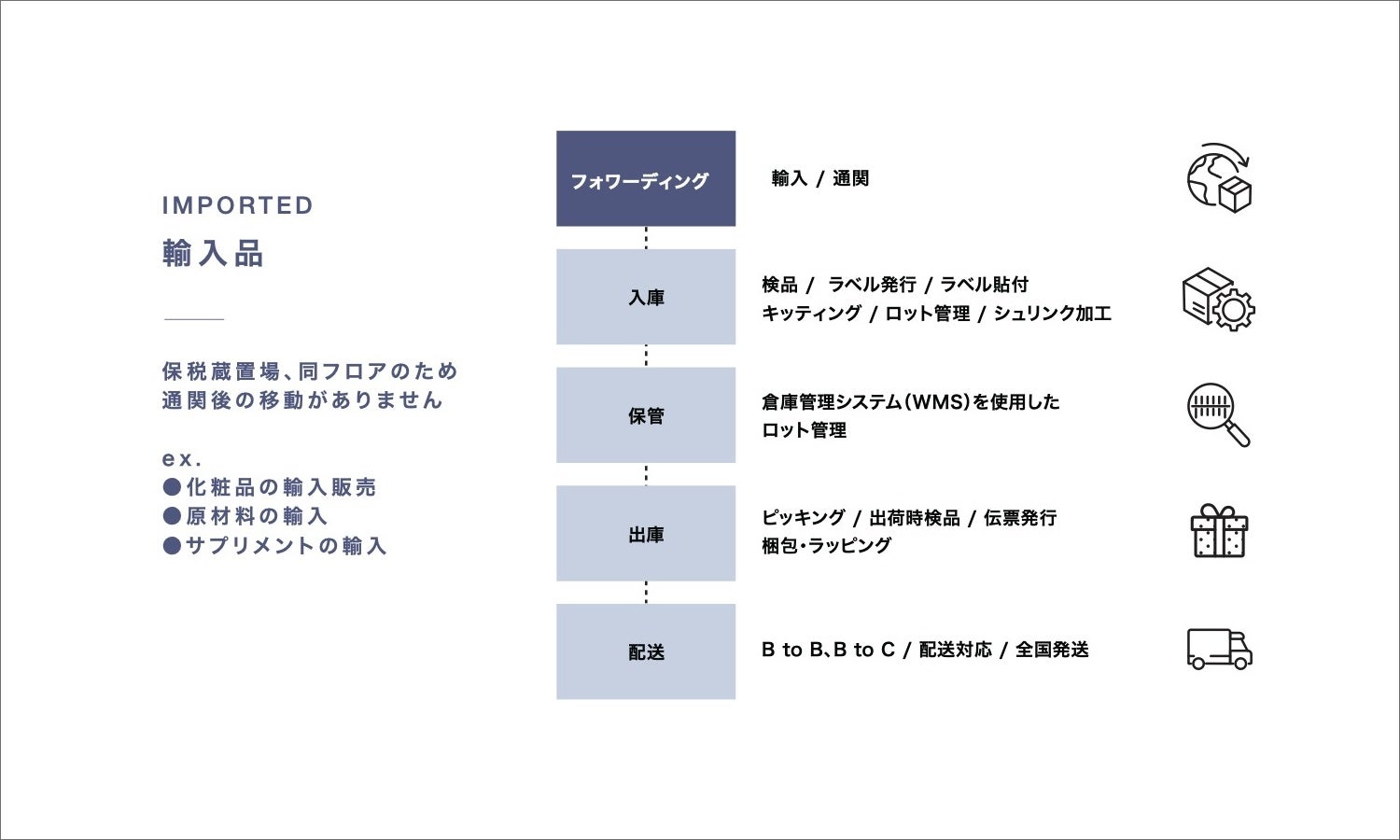輸入化粧品やサプリメント等の医薬部外品について、 保管や製品検査、流通加工、配送に至るまで、輸出入に関わる業務をワンストップで提供します。