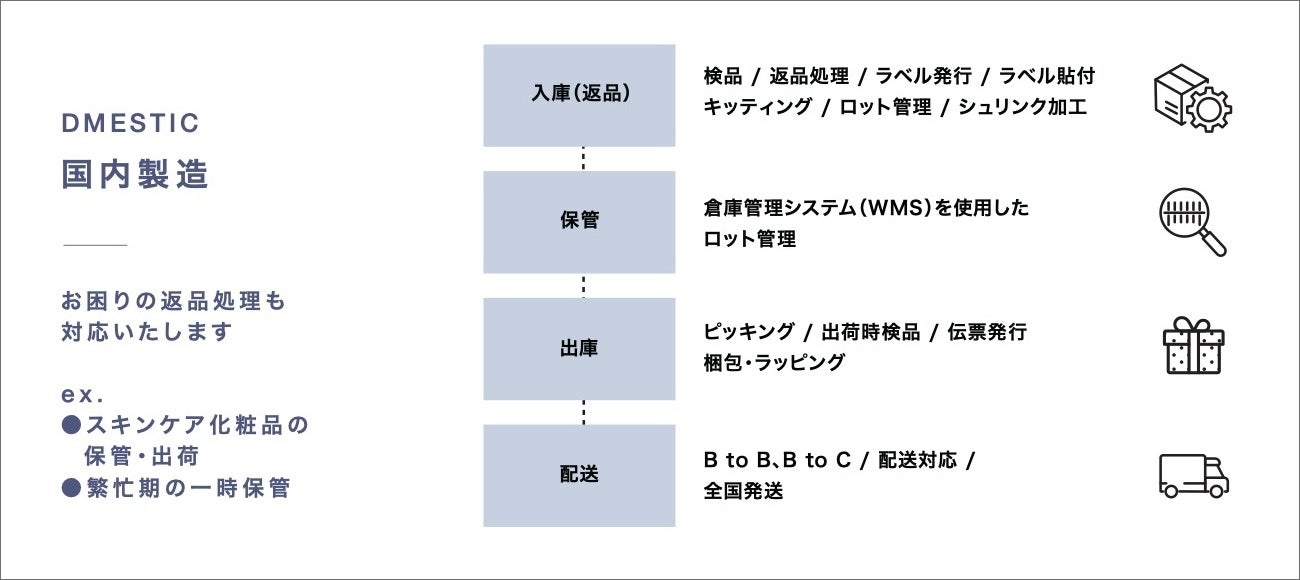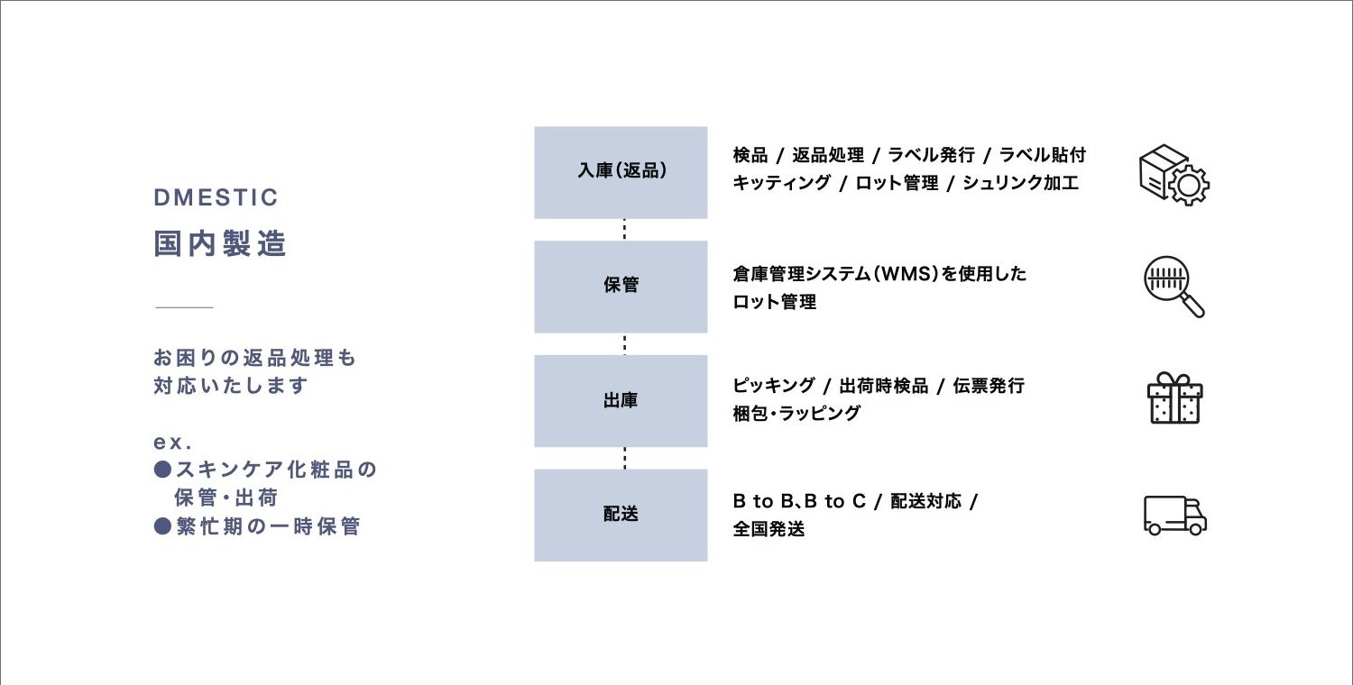 化粧品・医薬部外品製造業許可(包装・表示・保管)の認可を保有しており、ラッピング包装やピッキングといった出庫業務や、ラベルの貼り替えやパッケージ変更といった返品製品の再生作業を行えます。WMS(倉庫管理システム)による在庫管理で、小ロット多品種にも対応しています。