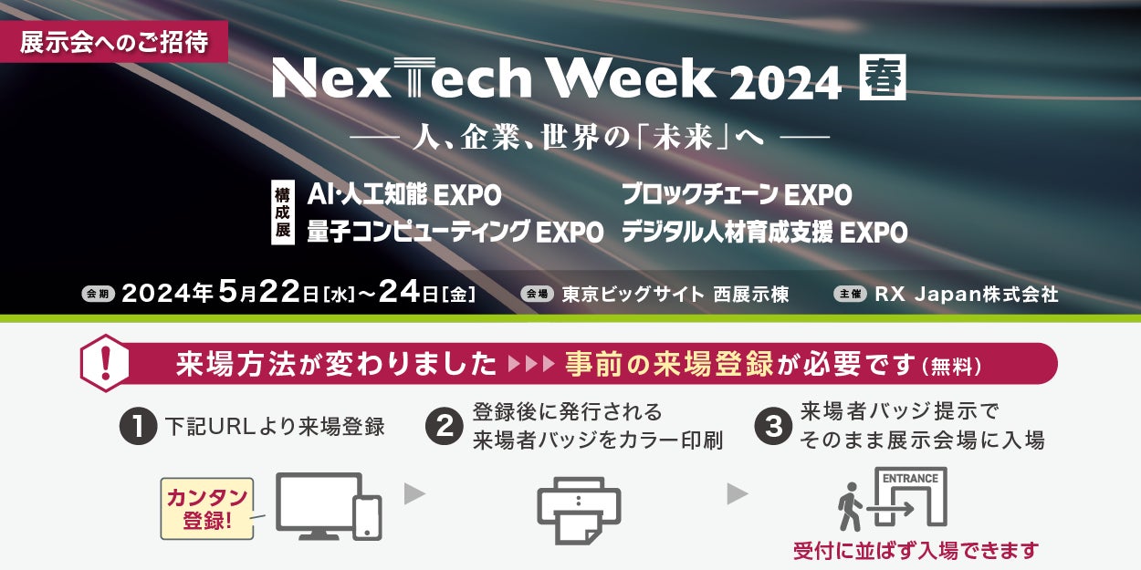 ◇NexTech Week[春]とは・・・ 「AI」「ブロックチェーン」「量子コンピュータ」「デジタル人材の育成を支援」の 4つの展示会で構成。DX を推進していきたい企業の方にとって欠かせない展示会です。