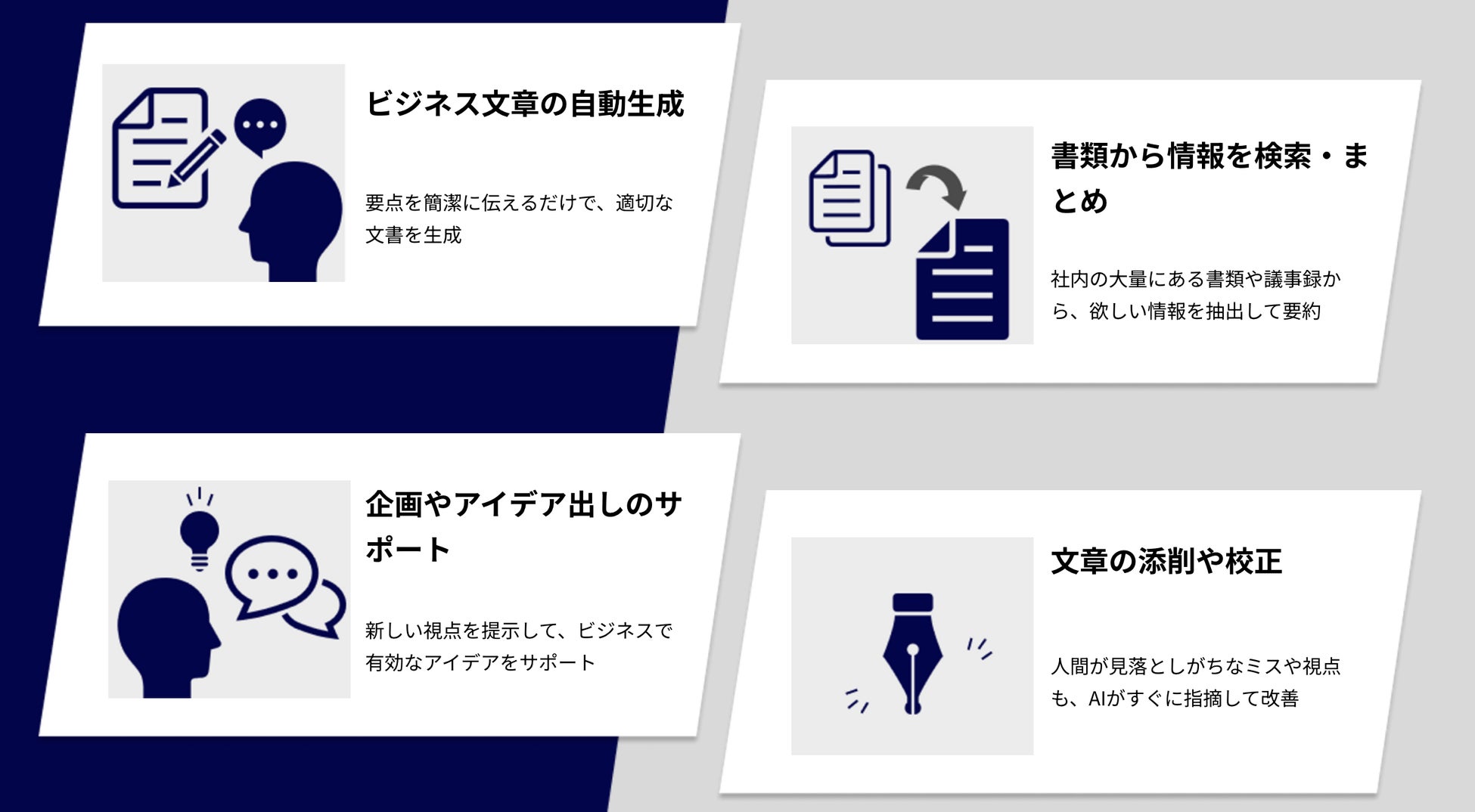 ビジネス環境に最適化されたAIアシスタントで、文章作成に関わる作業時間を削減し、より戦略的な業務に注力できるようになります。