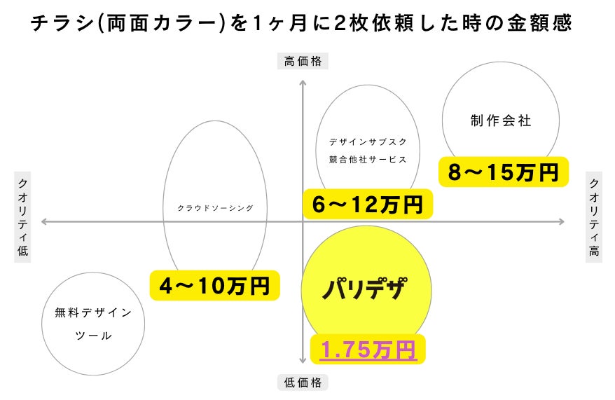 仮に両面チラシを制作会社に頼めば4~7万円程が相場で、1ヶ月に1枚の外注で年間48万円~84万円の費用がかかってしまいます。バリデザに依頼した場合、頼み放題で年間20万円程と大幅なコストダウンができます。