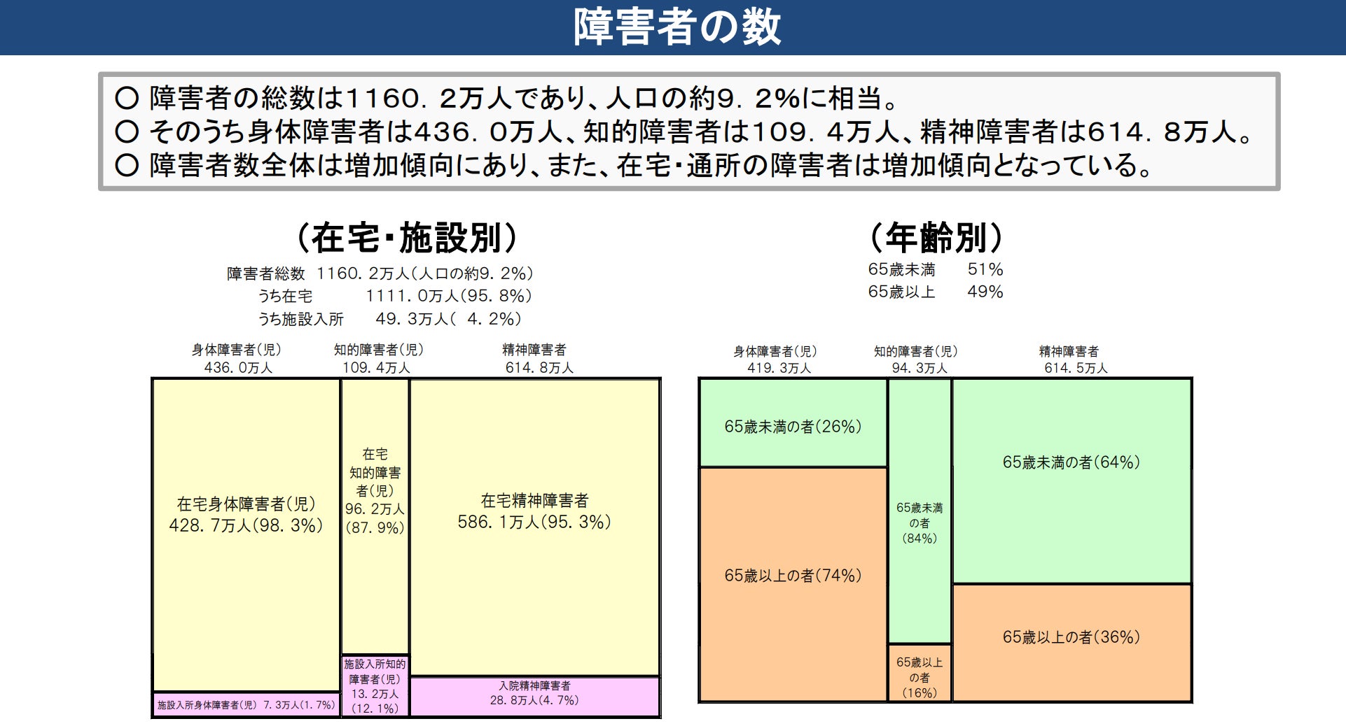 障がいをお持ちの方は現状1160万人(R5年データ)とされ、年々増加傾向となっています。それに伴い就労継続支援事業所は年々増加していますが、事業所の作業内容の多くは内職や軽作業等が多く、雇用契約を結んでいるのにも関わらず生産性が伴っていない事業所が多数存在しており、厚労省からも問題視される声が上がっています。