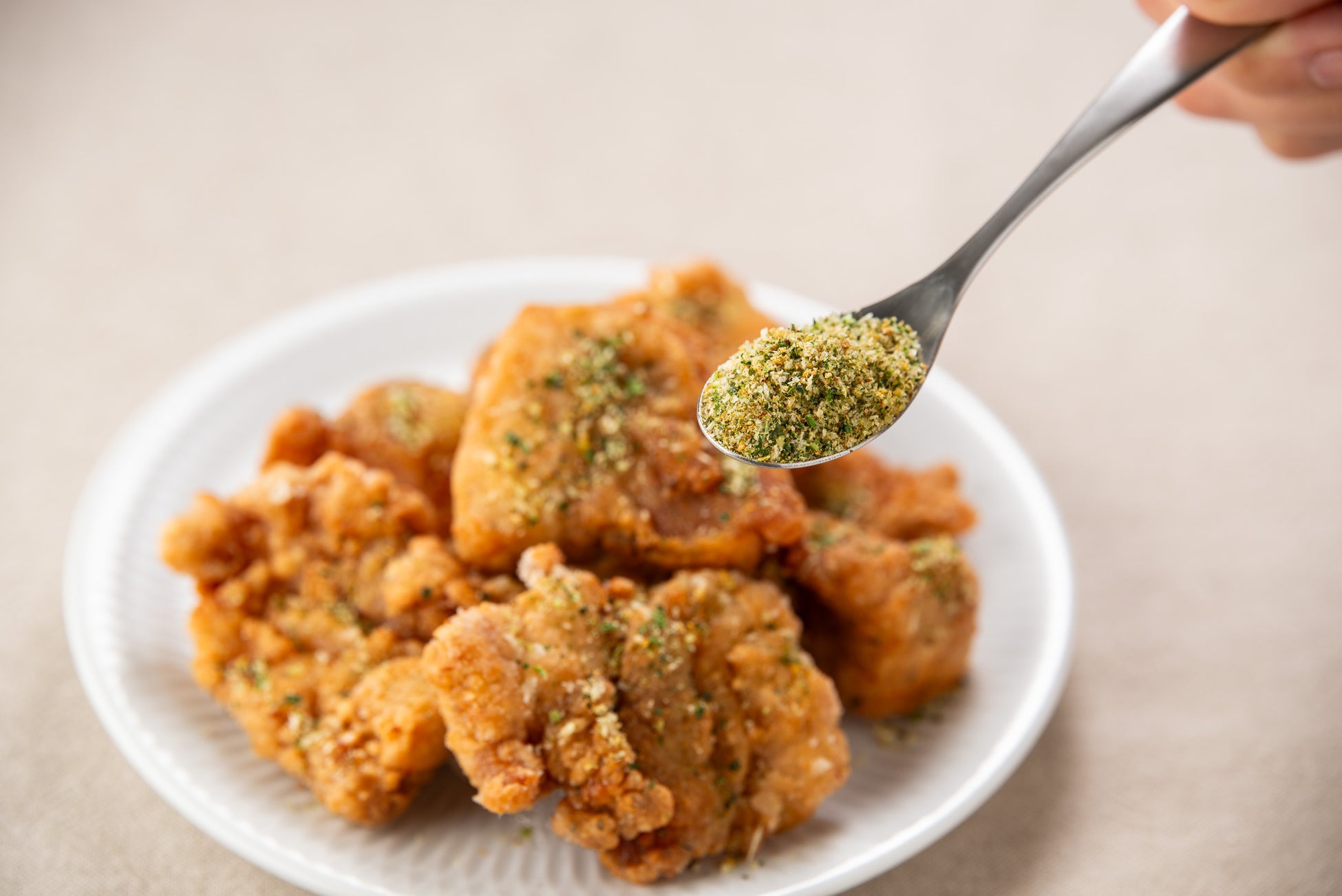 にんにく・黒コショウ・コリアンダー・バジルなど様々なスパイスに、サクサクとした食感を与えるパン粉を入れ、日本人の口に合う醤油やカツオ、昆布由来の調味料を配合。