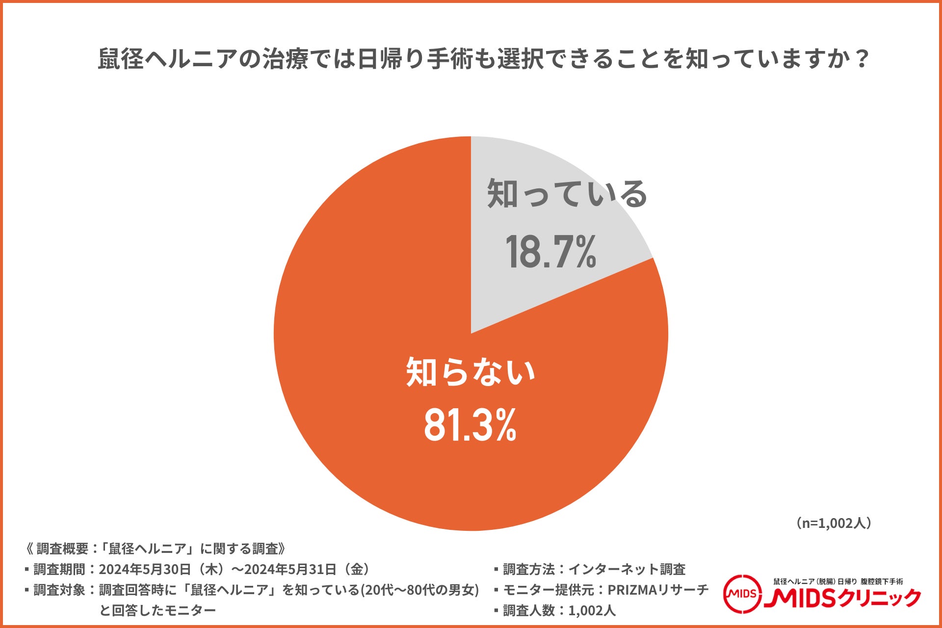 さらに、「鼠径ヘルニアの治療では日帰り手術も選択できることを知っていますか?」と質問したところ、約8割の方が『知らない(81.3%)』と回答しました。