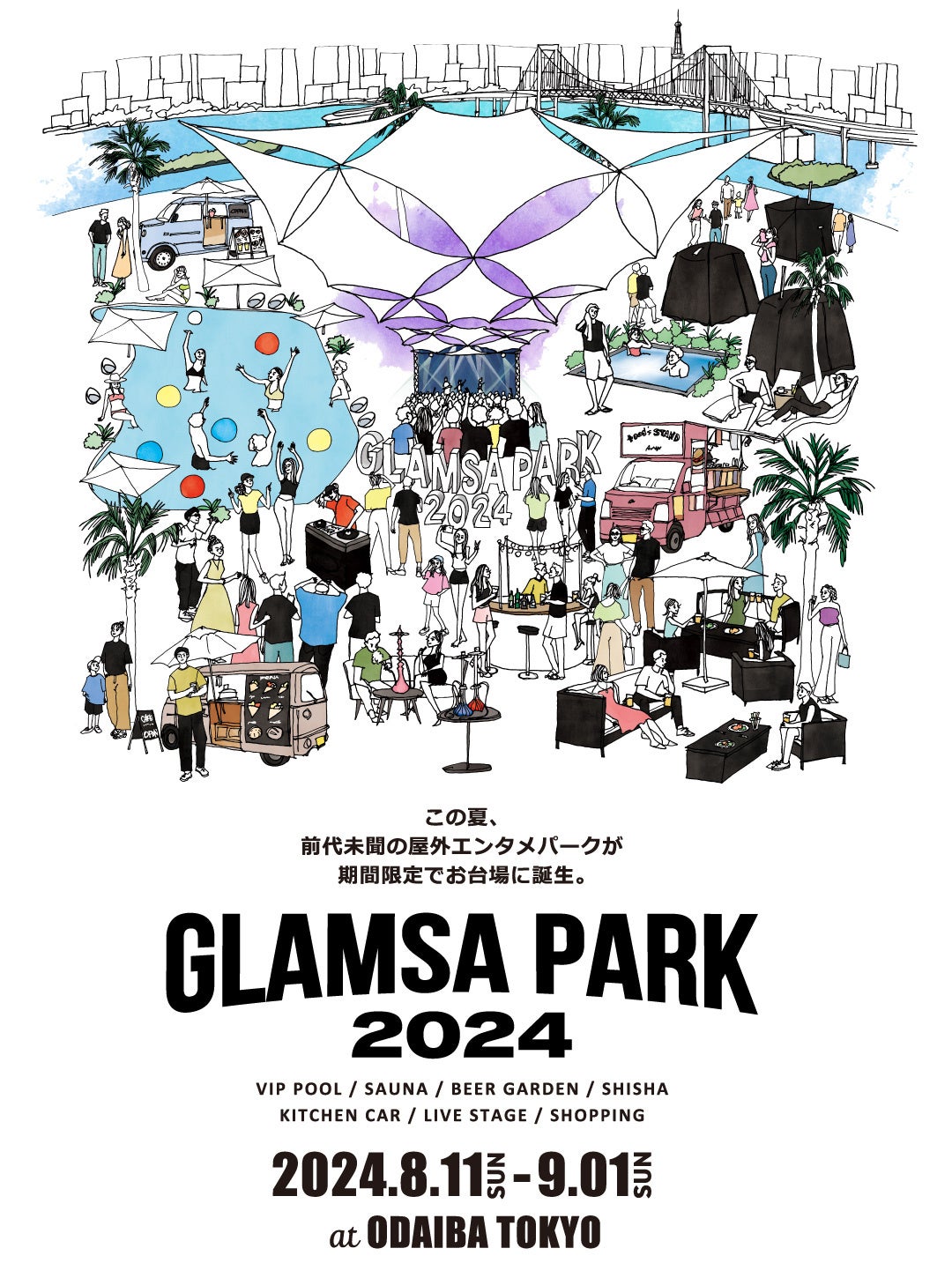 「GLAMSA」は、これまで地方創生を目指し、自然豊かな地で国内最大級のエンターテイメント・サウナフェスを開催してまいりました。この度、国内のどこからでもアクセスしやすいお台場にて、「GLAMSA」の世界観に触れることのできる新業態の都市型イベント「GLAMSA PARK」を初めて開催します。サウナ・プール・ビアガーデン&BBQ・キッチンカー・イベントステージなど今話題のコンテンツを、各業界のプロフェッショナルが集結し、作り上げる究極のエンターテインメントパークとなっております。会場は「PEACE STOCK 79'」や「DEEPサマーフェスティバル」など数万人規模の大型フェスが開催される「野外特設ステージ」に隣接しており、フェスに来たついでに気軽にお立ち寄りいただけます。夏のお台場といえば様々なイベントが開催され、東京でもっとも盛り上がるエリアの一つです。「GLAMSA PARK」は、誰もが心躍る空間づくりで、ご来場いただく皆様に最高の夏の思い出づくりをお手伝いします。詳細は随時発表してまいります。ぜひご期待ください。