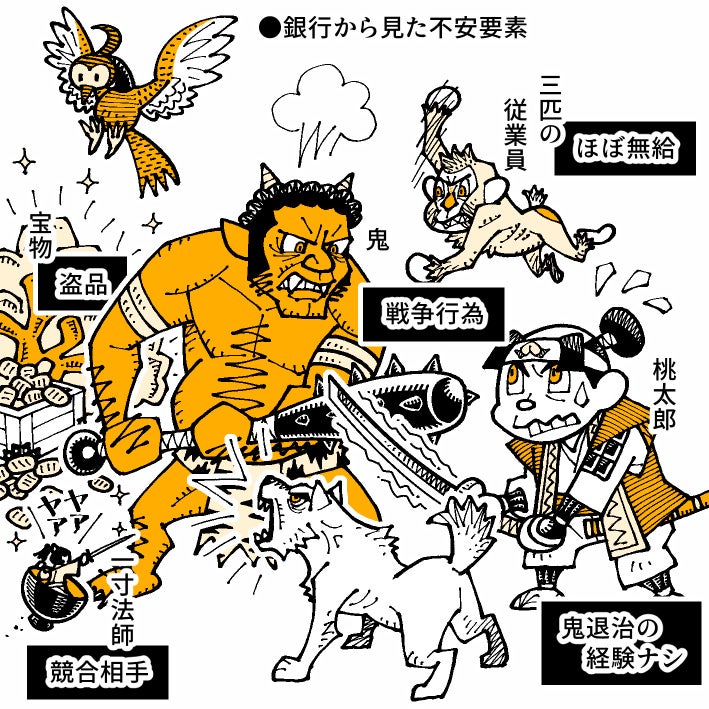 『桃太郎』は、鬼を退治しに、家来と一緒に鬼ヶ島に向かうお話。しかし、はるばる鬼ヶ島まで行って命がけの戦いをするので、食費、旅費、武器などおカネも相当かかるはず。この「鬼退治の費用」を工面するには、鬼退治を一つの「事業」として融資してもらおうと考えた筆者。