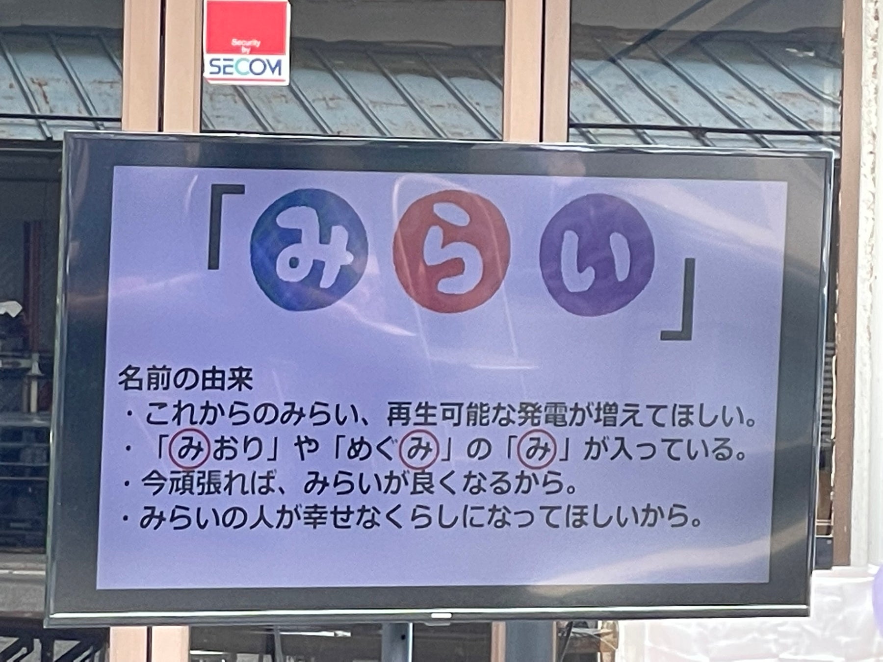 「みらい」には、「これからの未来にもっと再生可能エネルギーが増えてほしい」「未来の人たちに幸せな暮らしをしてほしい」「今頑張れば、未来がよくなる」という想いが込められています。