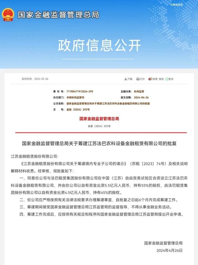 江蘇ファーバ農科設備金融リース有限公司が正式に設立準備を承認されました