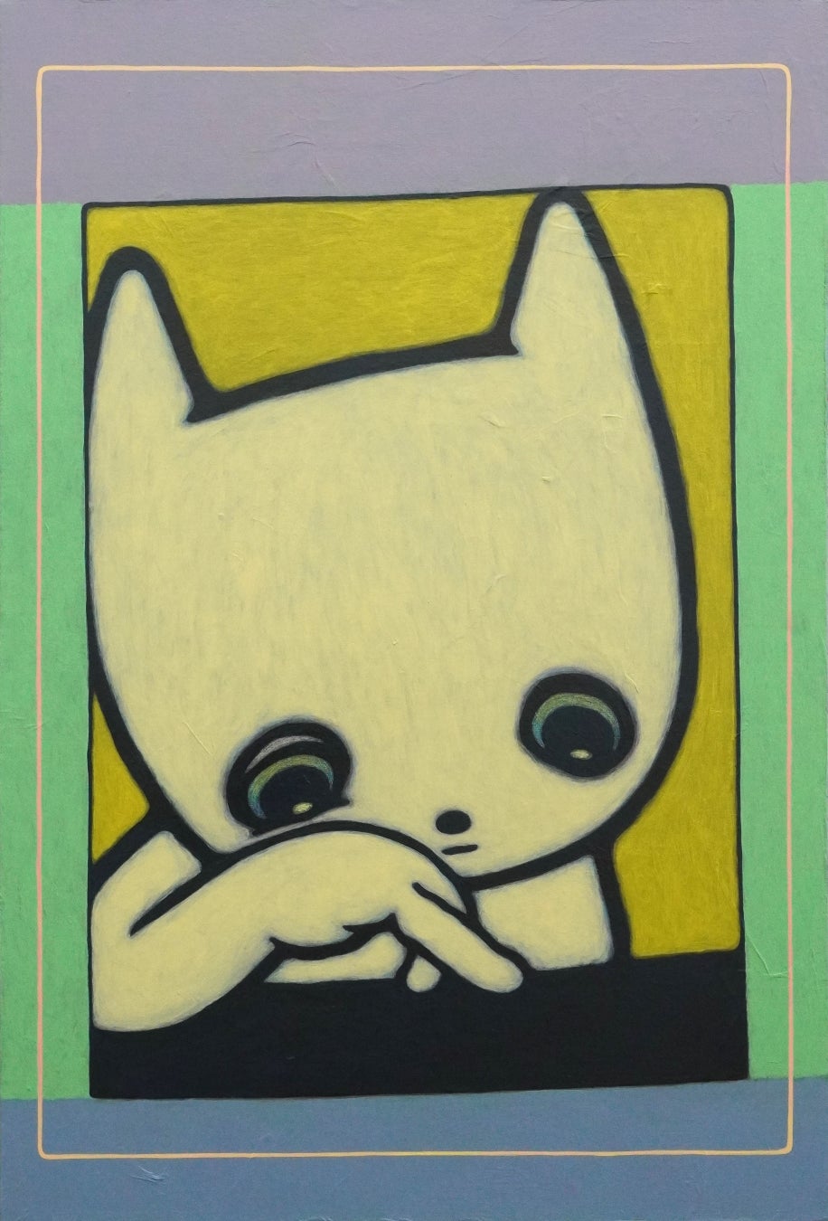 コバヤシ麻衣子は、その独特なキャラクターである名前の無い「いきもの」を媒介として、観る者の心に深く訴えかける作品で知られ、国内外で多くのファンを持つアーティストです。支持体としてキャンバスに破った和紙を張り込み、アクリル絵具などで丹念に描き出された、愛らしい外見に物憂げな表情を併せ持った不思議ないきもの。その画面からは、鑑賞者の気持ちに寄り添い、受容し、包み込む、といったような心理的共感が強く呼び起こされます。コバヤシ作品の持つ、センチメンタリズムというより更に奥深い、鑑賞者の持つ潜在的な深層心理(深い悲しみや寂しさ、静かな怒り)に到達する力の発現には、常に驚かされます。