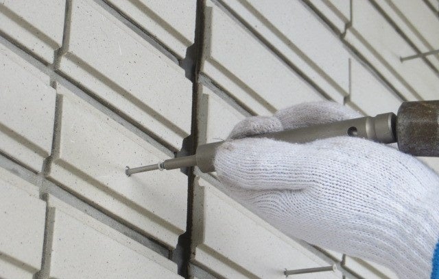 専用アンカーピンを脳天打ちすることにより、外壁の意匠性を保持して、タイルの落下を防止することができる工法