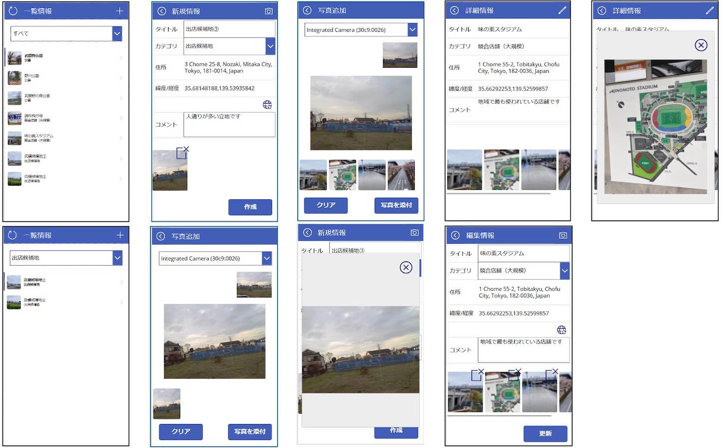 新店舗の出店検討で使う、スマホを使った情報収集アプリを作成。 ある会社では、新店舗の出店にあたり、効率的な情報収集の仕組み を検討している。 担当者が現地でスマホを使い、近隣や環境に関する様々な情報を 収集、集めたデータはクラウドに保存し整理・分類し、すぐに 本社で収集したデータを元に計画を立案できる仕組みにしたい。 ※Youtube動画によるシナリオ紹介:なぐすがチャンネルの紹介動画 |