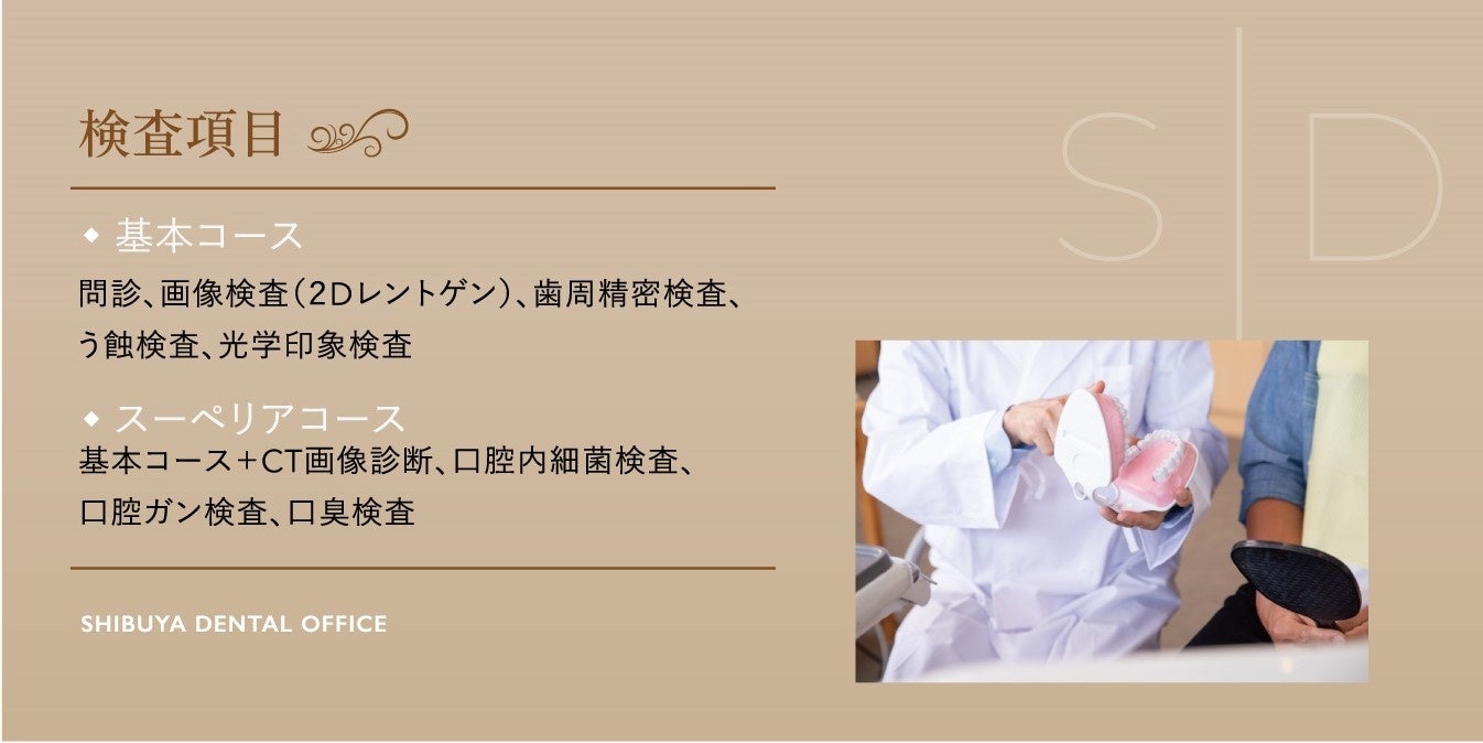 人間ドックの歯科版。口腔内の精密検査により、自覚症状のない歯の異常や細菌感染、噛み合わせなど、将来発生しうる口腔内の問題箇所をいち早く見つけられます。また、口腔内の軟組織チェックにより、癌を含む口腔疾患の発見も可能です。