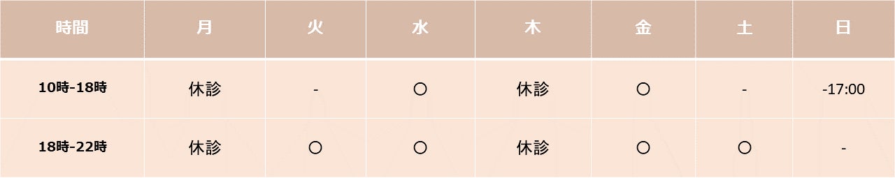 営業:水・金: 9:30 - 21:30、火・土:17:30 - 21:30、日:9:30 - 16:30 (月・木・祝休診)