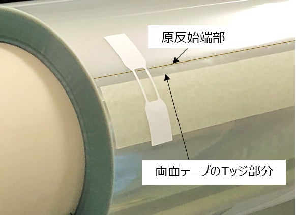 ①原反を繰り出し軸にチャッキングし、市販のスプライス用両面テープを、原反始端部に貼り付けます。このとき、原反始端部と、両面テープのエッジ部をできるだけ合わせます。
