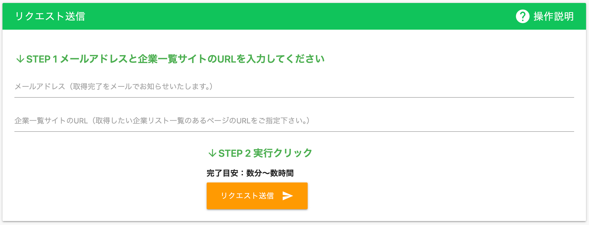 必要なステップはたった2つ。「情報を取得したいサイトのURLを指定」→「ボタンをクリック」。これだけのステップで、誰でもカンタンに企業リストを集められます。