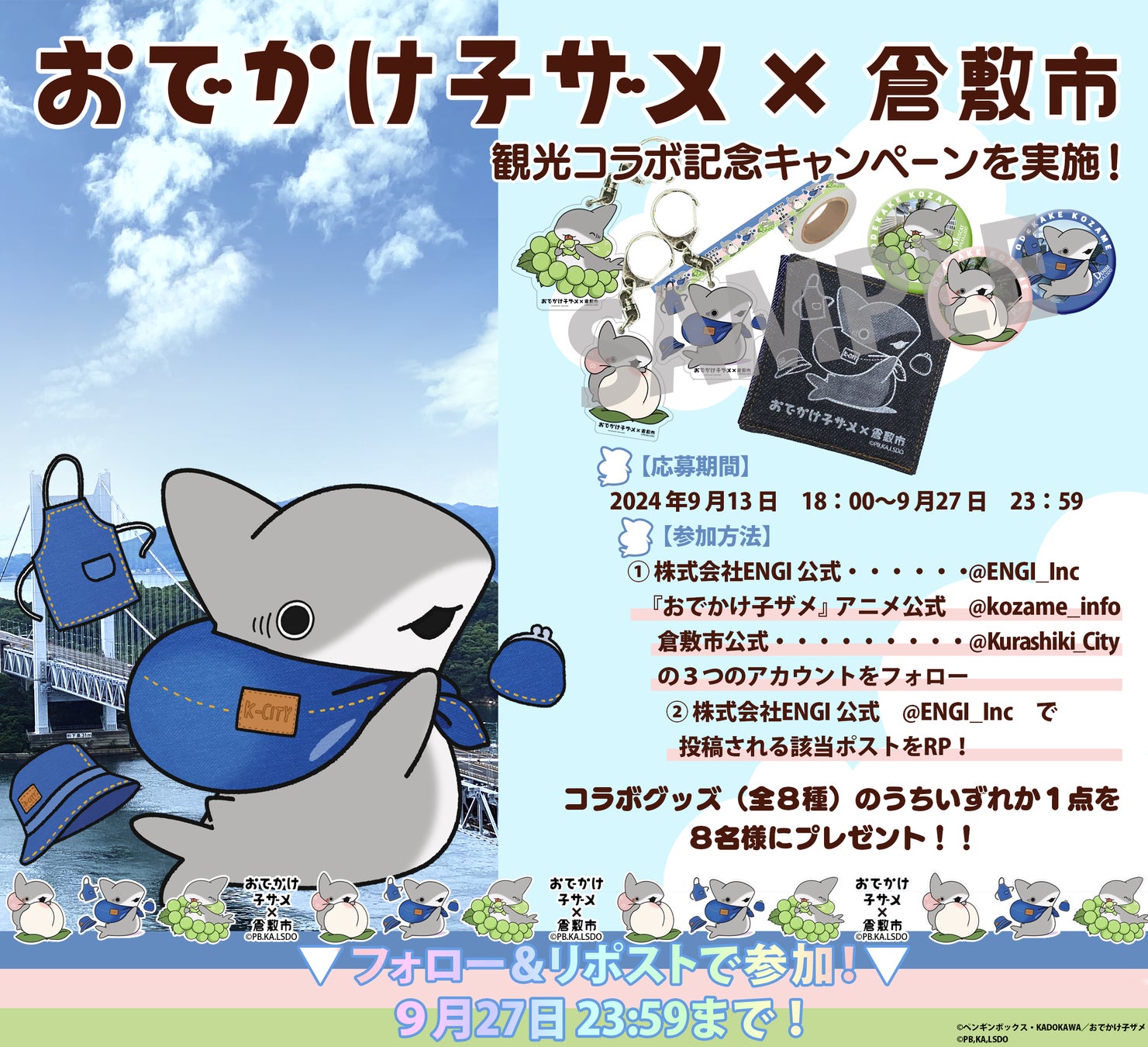 株式会社ENGI(本社:東京都中野区 代表取締役社長:吉岡宏起)は、ENGIの制作する人気アニメーション「おでかけ子ザメ(原作:ペンギンボックス)」と倉敷市とのコラボを、2024年9月17日からスタートすることを発表いたします。