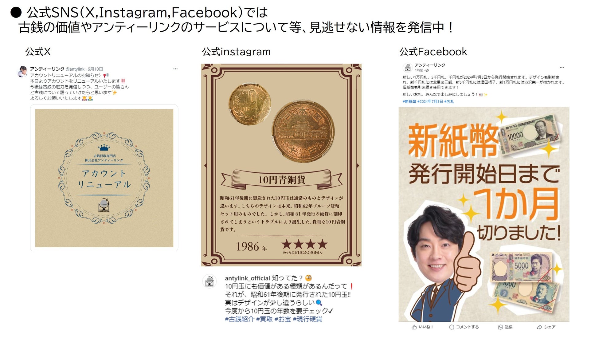 このたび、古銭の価値について情報発信するSNS(X、Facebook、Instagram)をオープン&リニューアルします。古銭にまつわる歴史、現行貨幣のなかで価値があるものについて情報発信するので、アンティーク硬貨、古銭に興味のある方、いつか売却しようと考えている方は、ぜひフォローしてください。