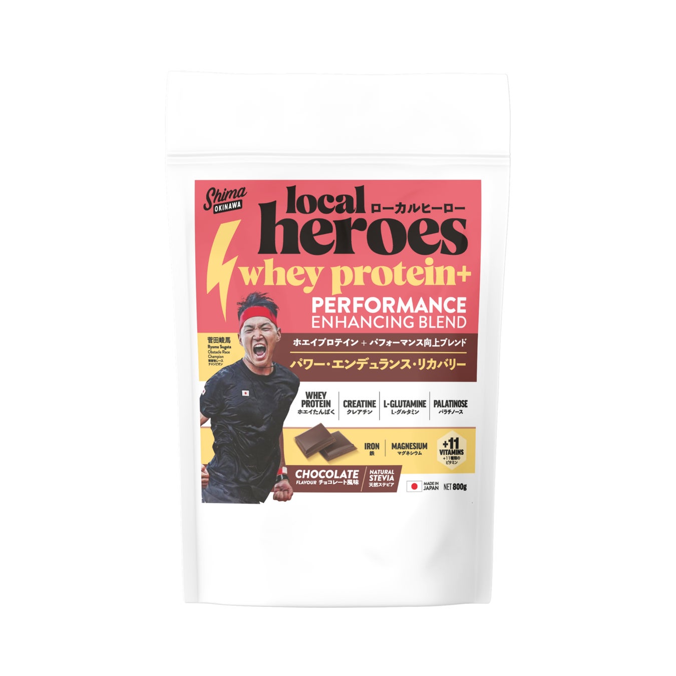 ローカルヒーロー ホエイプロテイン + パフォーマンス向上ブレンド:障害物レースチャンピオン菅田崚馬と共同開発されたチョコレート風味のブレンド。ホエイプロテイン、クレアチン、グルタミン、ビタミンを配合し、トレーニング後に最適な栄養を補給します。