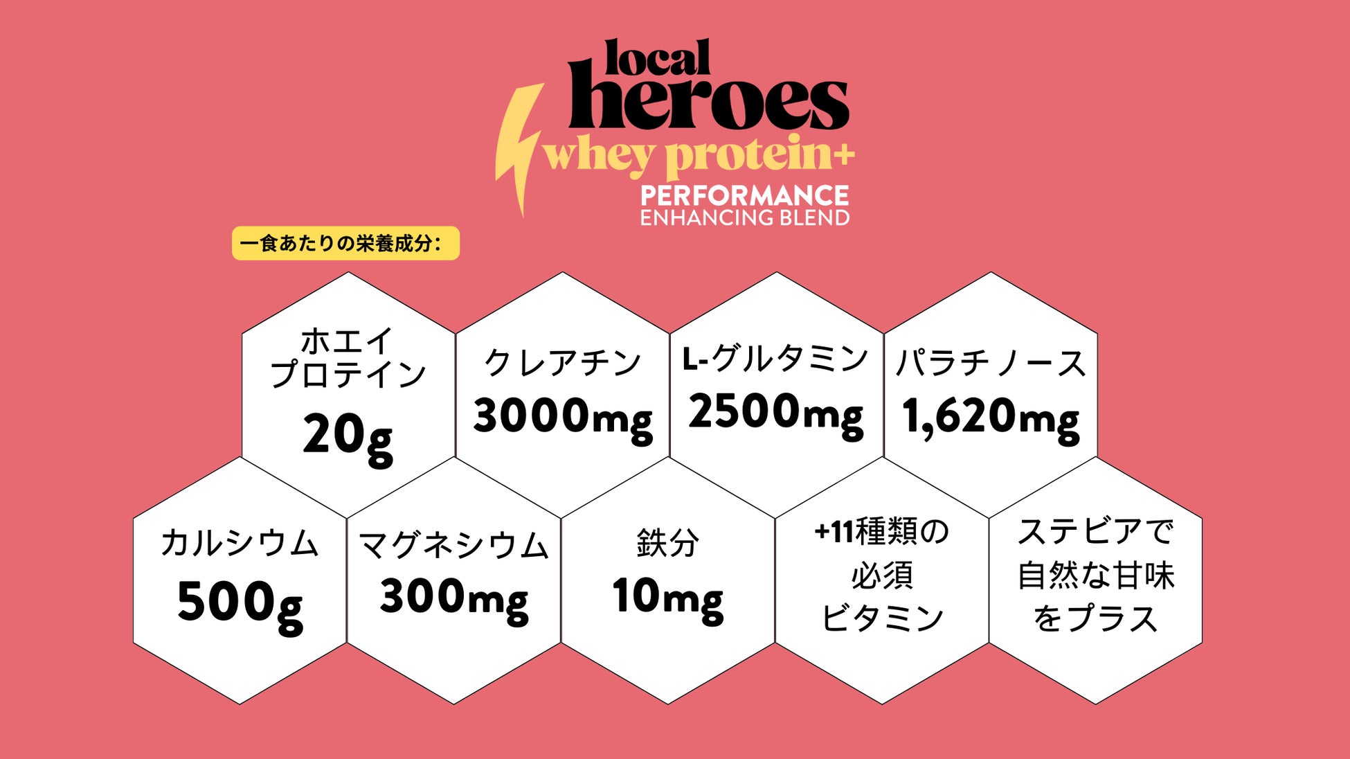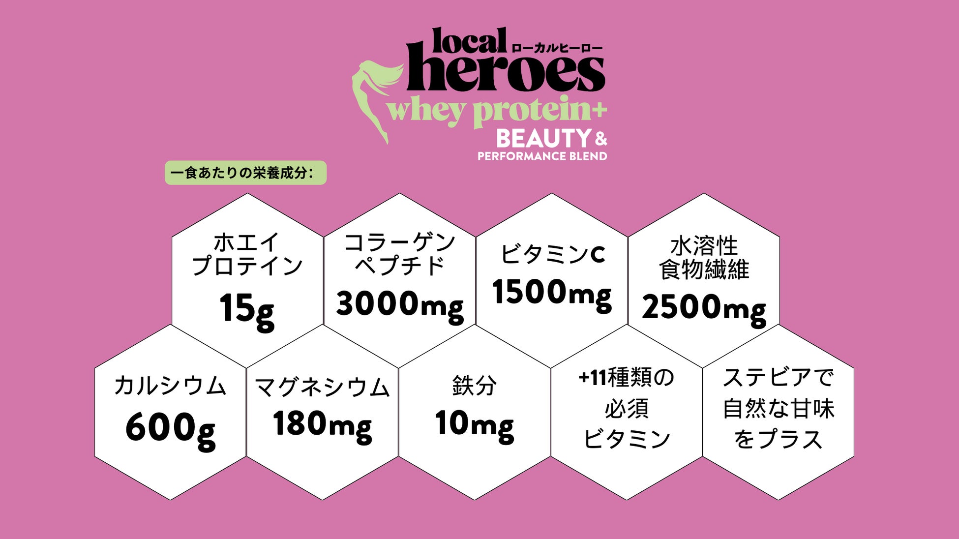 ローカルヒーロー ホエイプロテイン + 美容 & パフォーマンスブレンド:ウルトラマラソンチャンピオン尾藤朋美と共同開発されたヨーグルト風味のブレンド。ホエイプロテイン、コラーゲン、食物繊維、ビタミンを含み、体の内外から健康をサポートします。
