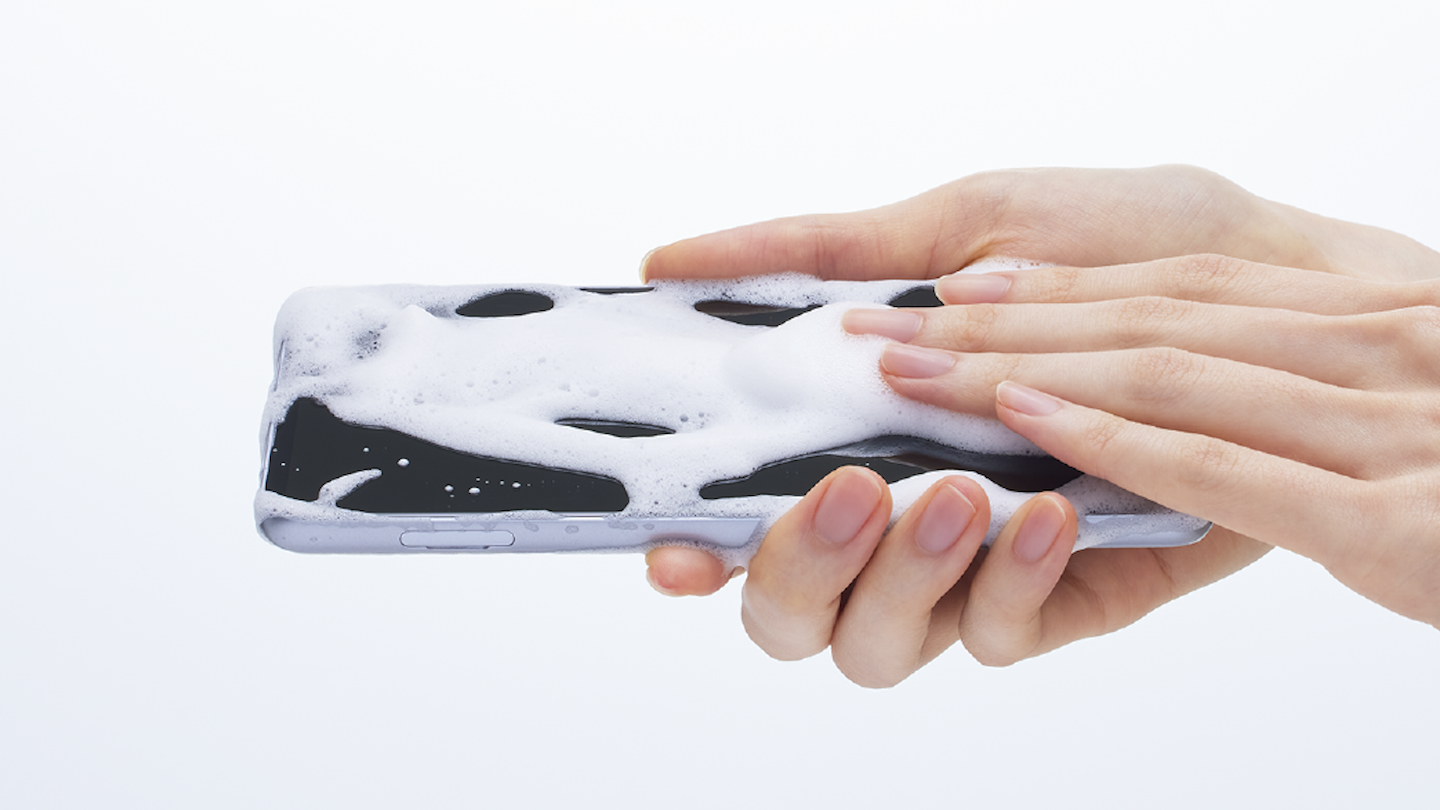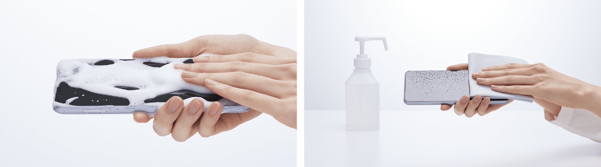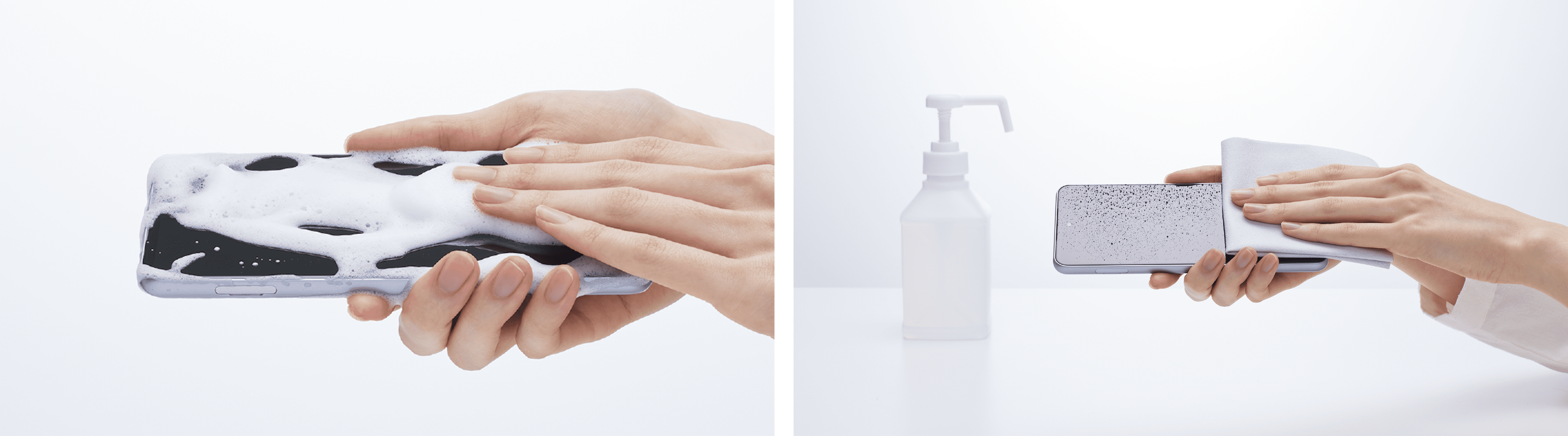 国内メーカー製の家庭用泡タイプのハンドソープあるいは国内メーカー製の家庭用液体タイプの台所用洗剤を使って洗えます(FCNT合同会社試験方法による)。無故障を保証するものではありません。ついた泡は水道水でしっかりすすいでください。濡れた状態では、充電しないでください。洗い方の詳細については「FCNT合同会社のWebサイト」でご確認ください。