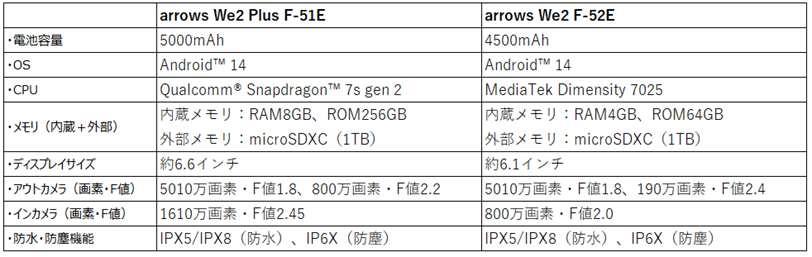 ※「arrows We2 Plus F-51E」「arrows We2 F-52E」で一部スペックに違いあり