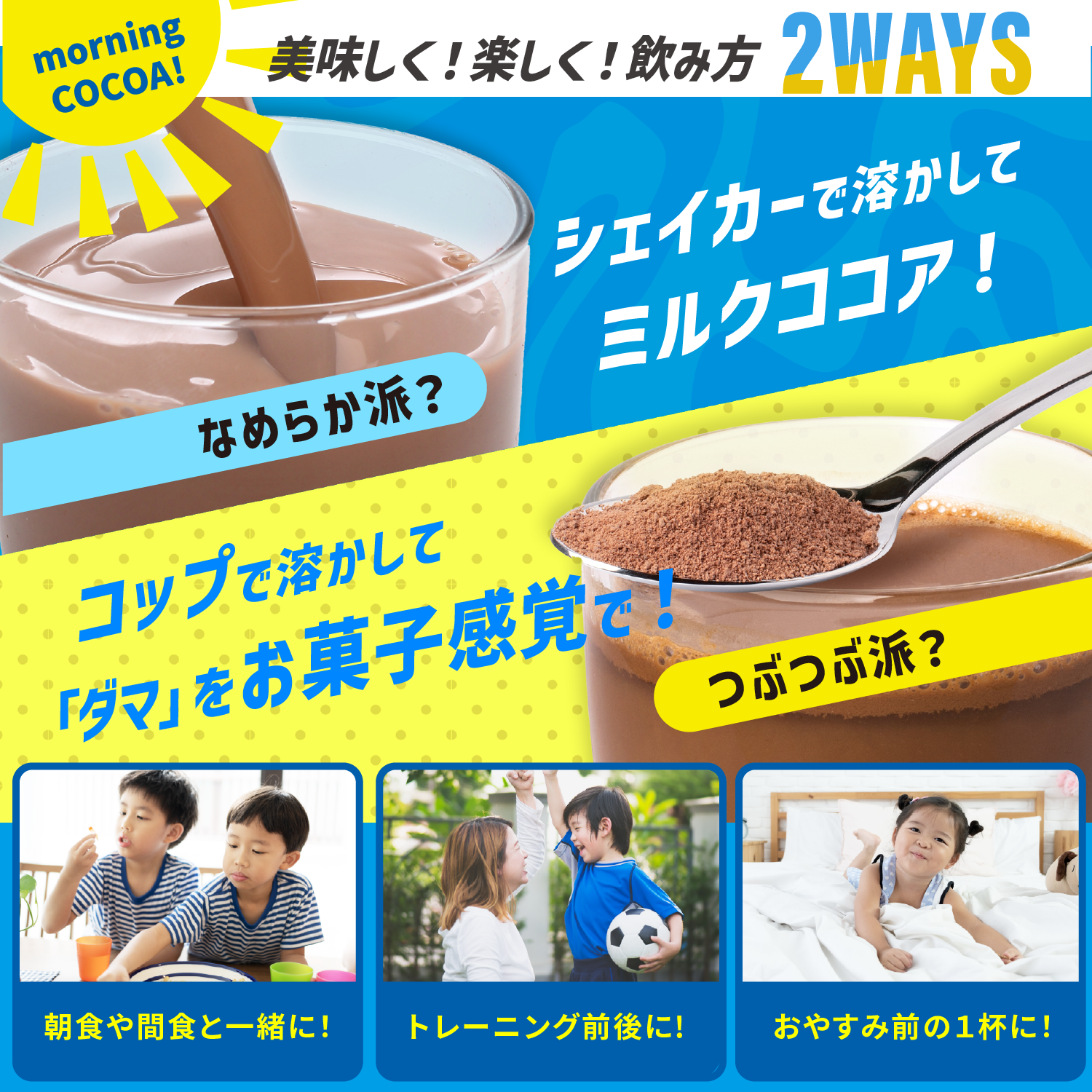 プロジェクトの第一弾として、全ての子ども達が健康課題なく運動や学習に取り組めるように価格と品質にこだわり、厚生労働省が定める基準を満たした「朝の完全栄養ココア」を発売開始致します。