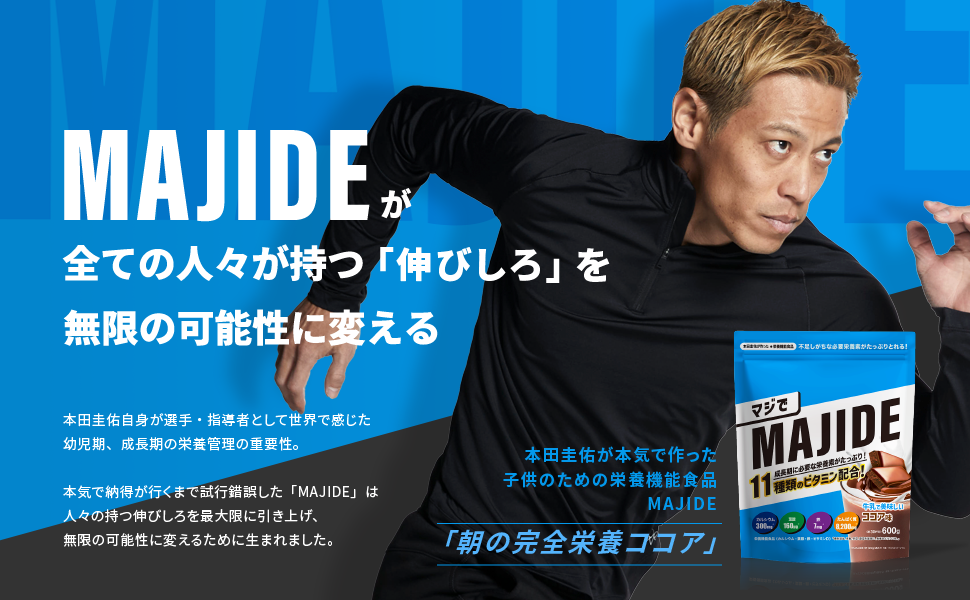 本田圭佑が選手/指導者として世界を渡り歩き、感じた栄養管理の重要性。特に幼児期、成長期にこそ、その重要性は高まりますが、日本や世界を見渡してもその課題に答えられる商品は少ない。そんな課題をMAJIDE(マジで)解決するため、本田自身が納得のいくまで試行錯誤して開発した商品です。
