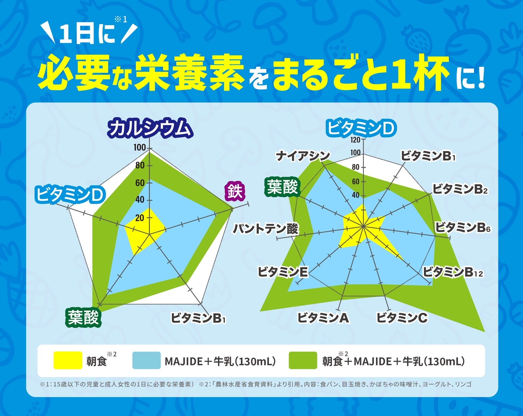 ※牛乳130mlにMAJIDE1食(20g)を溶かしてとれる栄養素を食材に置き換えた場合の目安量です。