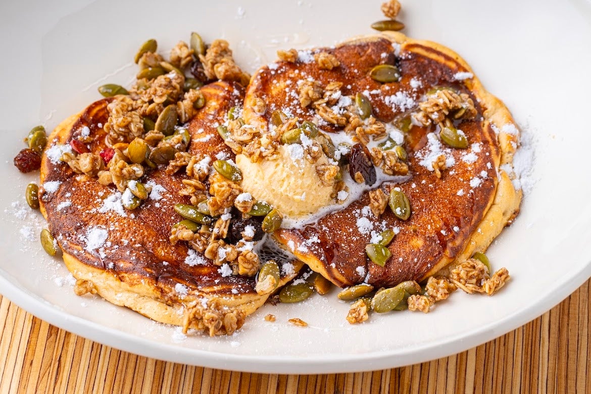 リコッタチーズとシナモン、バニラをふんだんに使用したふわふわパンケーキにカボチャの種のグラノーラでアクセントに。