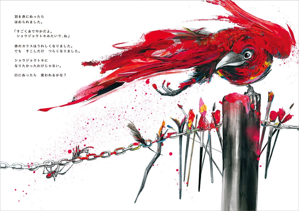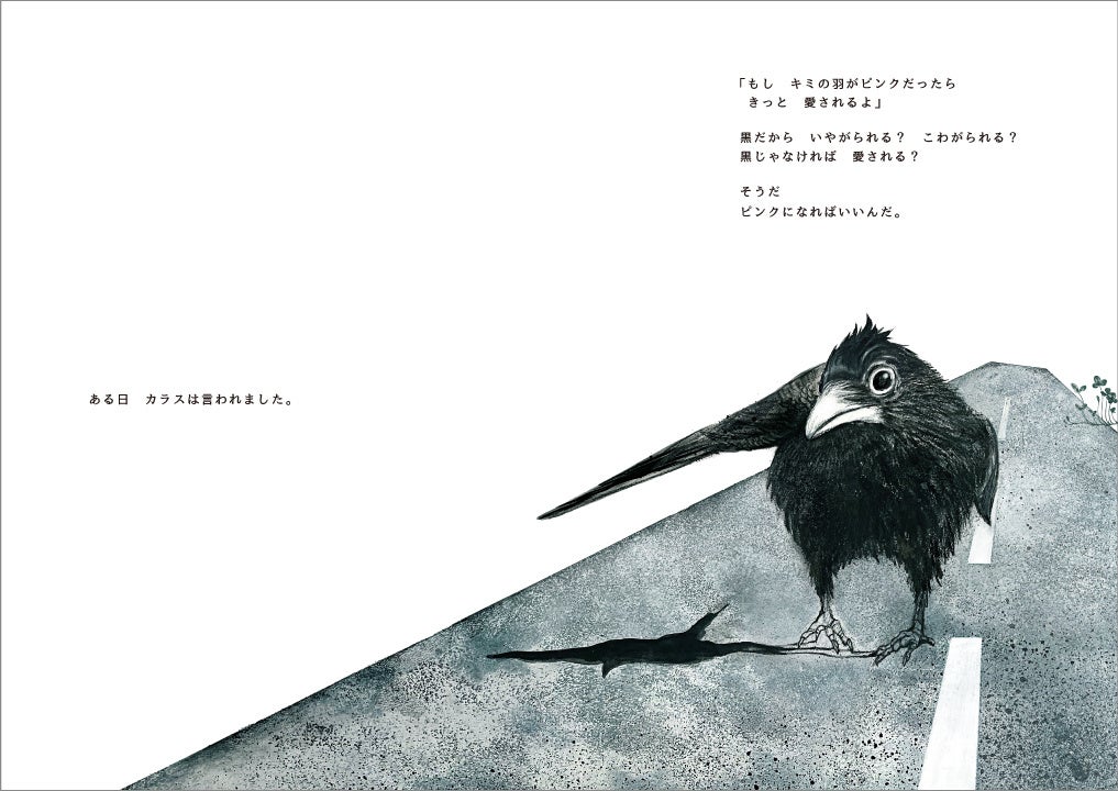 ある日、カラスは言われました。「もし、キミの羽の色がピンクだったら?」。その言葉をきっかけに、カラスは自らの羽の色について考え始めます。そして、辿り着いた先には……? 大切なもの、大切なことに気づき、ほかの誰でもない、自分自身として逞しく一歩を踏み出すまでの、羽の色を巡る、カラスの旅物語。鮮やかで精緻な画と、リズミカルで穏やかな文章が融合し、絵本に初めて触れる子供から経験を重ねた大人まで楽しめる作品となっています。