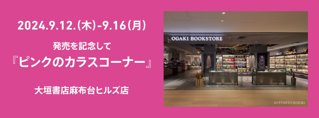 本書の発売を記念して、2024年9月12日(木曜日)~9月16日(月曜日)、大垣書店麻布台ヒルズ店にて『ピンクのカラスコーナー』を展開いたします。新発売されるA4判の『ピンクのカラス』(ホームエディション)に加え、先行発売していたA3変型判『ピンクのカラス』(アートエディション)、絵本から主人公が飛び出したかのようなポストカードも販売いたします。※なお、イベント終了後も、『ピンクのカラス』はA4・ホームエディション、A3変型・アートエディションともに、大垣書店麻布台ヒルズ店にて継続的に販売されます。