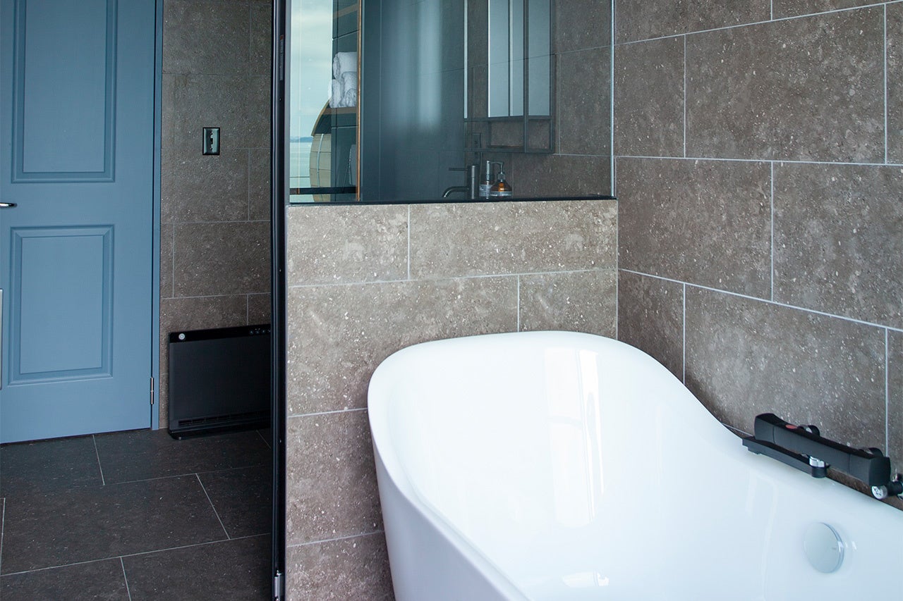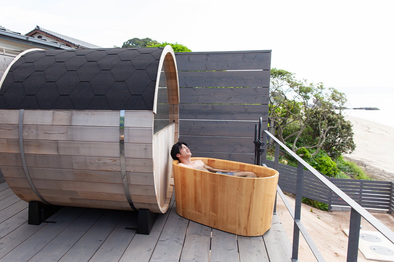テラスには海が見えるバレルサウナと水風呂を完備。美しい景色を眺めながら、ととのうことができます。ビーチより高い位置にあるため、プライバシーも確保しながら、景色とサウナを楽しむことが可能です。