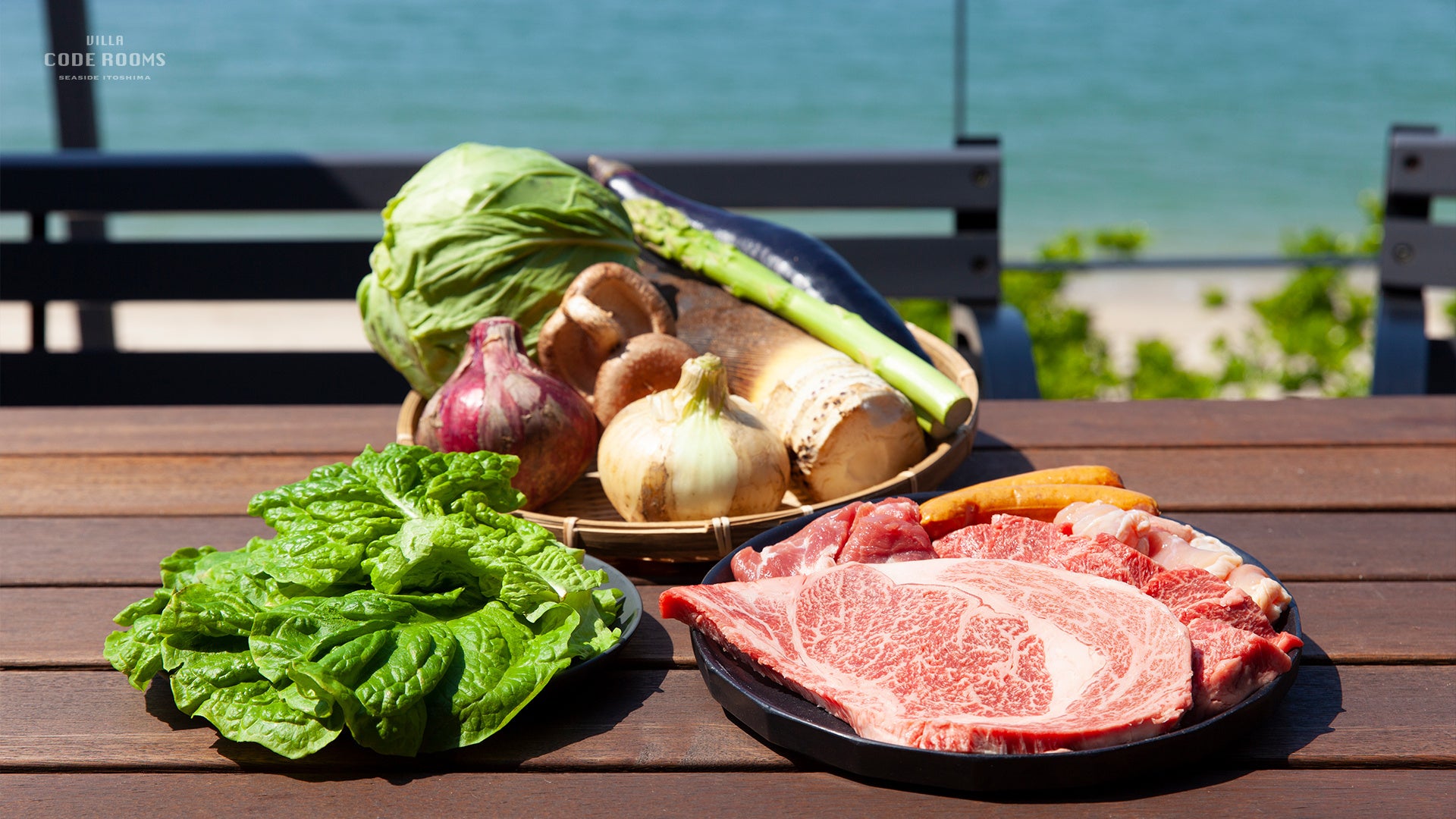 糸島・鹿家の美しい海が目の前に広がるテラスで、地元産の糸島牛、糸島豚、そして新鮮な糸島野菜を使ったバーベキューを楽しむことができます。電気グリルやお皿、カトラリー類も用意されているため、買い出しも不要です。もちろん、追加で食材のお持ち込みも可能です。