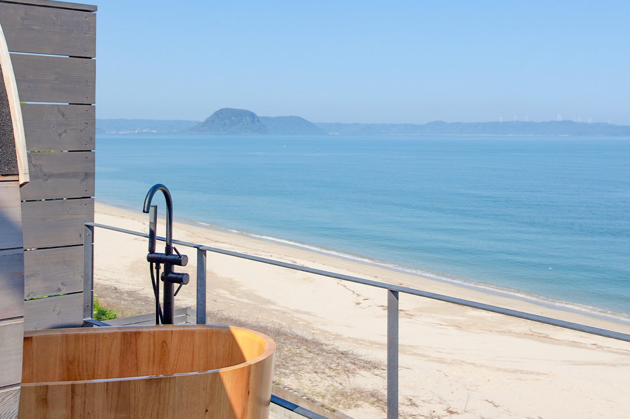 テラスからは直接ビーチにアクセスでき、糸島の美しい海を目の前に、地元産の糸島牛、糸島豚、そして新鮮な糸島野菜を使ったバーベキューを楽しむことができます。また、テラスに備え付けられたバレルサウナでは、海を眺めながらのサウナ体験が可能です。