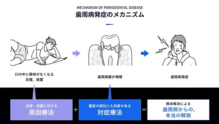 東北大学の菅野太郎教授らは、歯周病の原因療法と対症療法の双方に新しいテクノロジーでアプローチする「NEW DESIGNED PERIODONTAL THERAPY」を提唱し、約17年の歳月をかけて研究・開発を行いました。