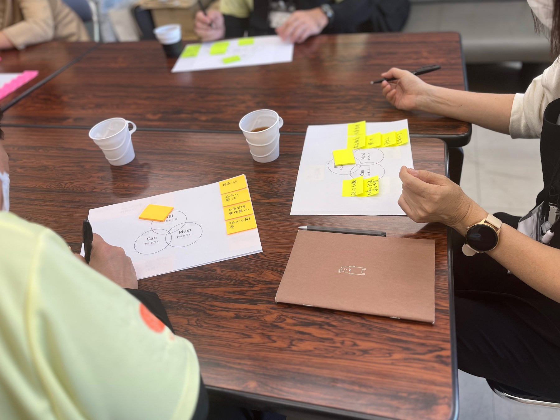 ロゴリニューアルにあたり、主要メンバーを集めてワークショップを行い、自社の強みや普段のサービスで意識していることなどを話し合い、ロゴの要素となる重要なキーワードを抽出しました。