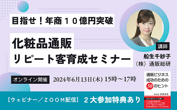 オンラインセミナー「目指せ通販年商10億円!化粧品通販 リピート客育成セミナー」6月13日(木)15時開催