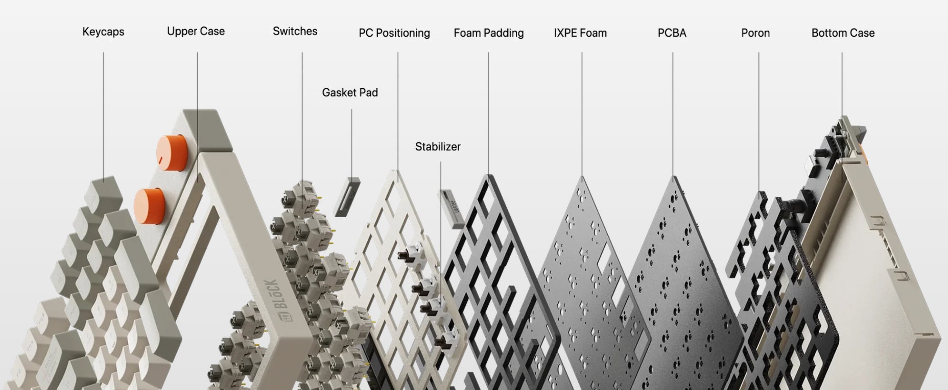 ポリカーボネイトのプレートに装着されたガスケットによって、TTC社と共同開発のキースイッチをキーボード本体から分離した構造になっています。また、Poronなどのフォームにより、タイピング時の振動をや反響音を減少させます。より静かで、より安定した、正確なタイピングを提供します。